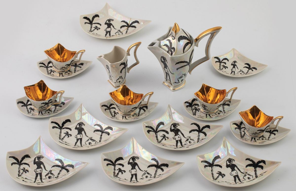 W składzie; dzbanek do kawy (18 cm), mlecznik (11 cm), 6 talerzyków (18 x 15 cm), 5 filiżanek (6,5 cm), 6 spodków (13,5 x 10,5 cm)
