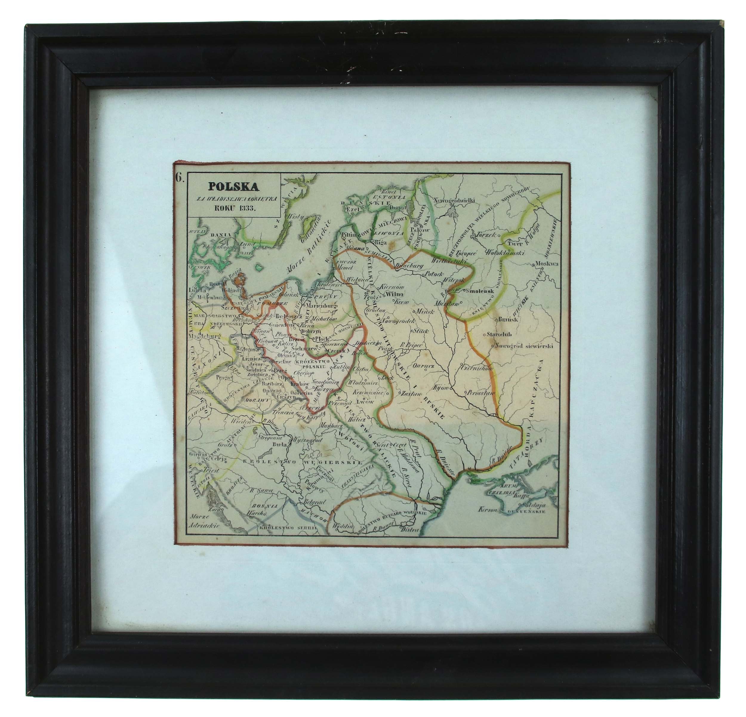 Dokumenty Mapa Polski za Władysława Łokietka, 1333, w ramce. Litografia kolorowana z Lelewela XIX w. Wym. 24 x 25cm.