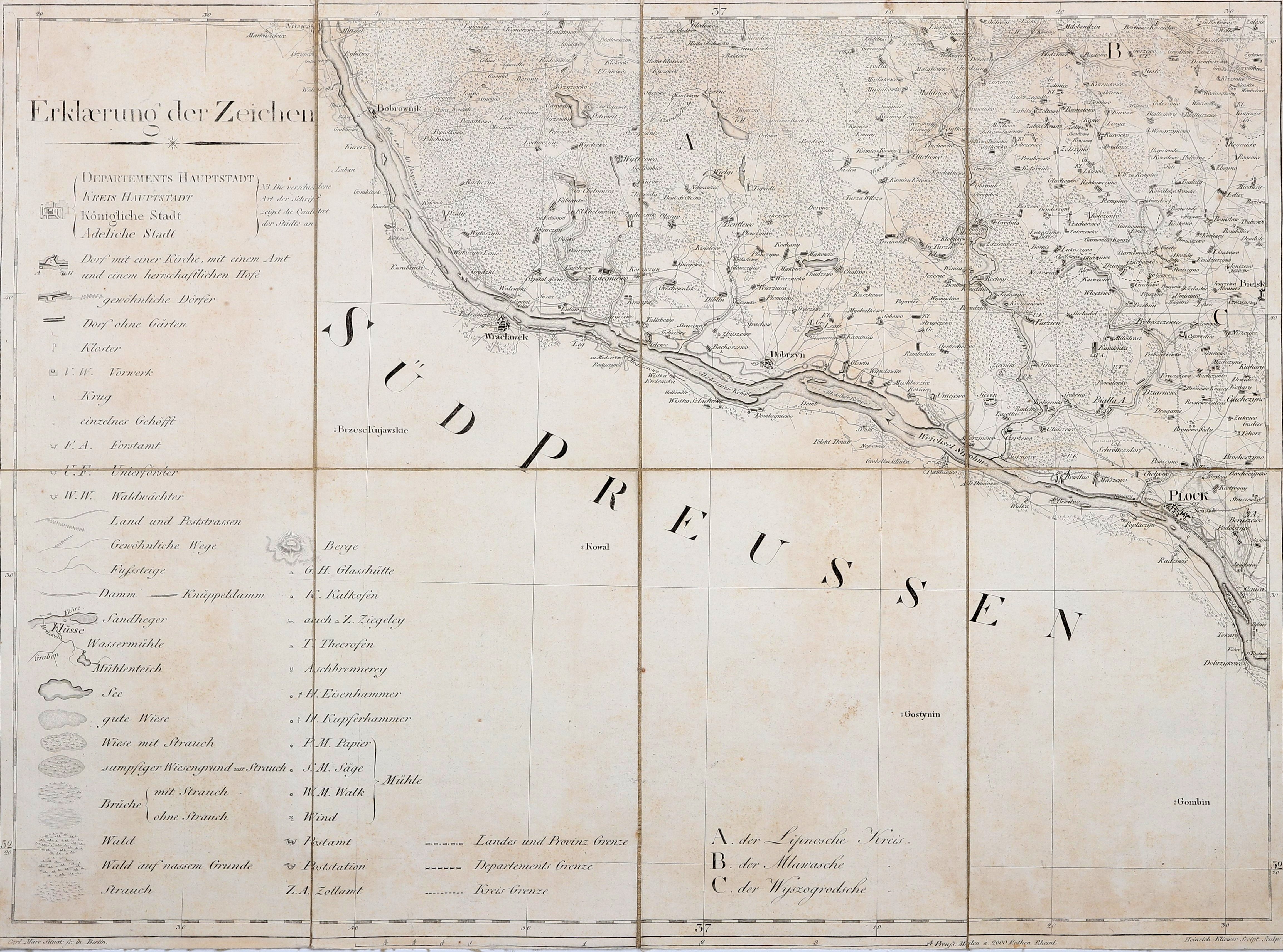 WISŁA, PŁOCK, BOBROWNIKI, PRUSY NOWOWSCHODNIE. Mapa BIEGU Wisły na odcinku od Płocka po Bobrowniki; sekcja X wielkoformatowej mapy; ryt. H. Kliewer i C. Mare, oprac. J.C. Textor, wyd. D.F. Sotzmann, 1808; z lewej str. legenda; miedz. cz.-b., st. bdb., lekkie zabrudzenia i zażółcenia, mapa podzielona na 8 sekcji podklejonych wspólnie płótnem; wym. 560x415 mm; bez tyt.; BARDZO RZADKIE! [por. XXXI aukcja Antykwariatu Wu-el, obiekty 506-510].