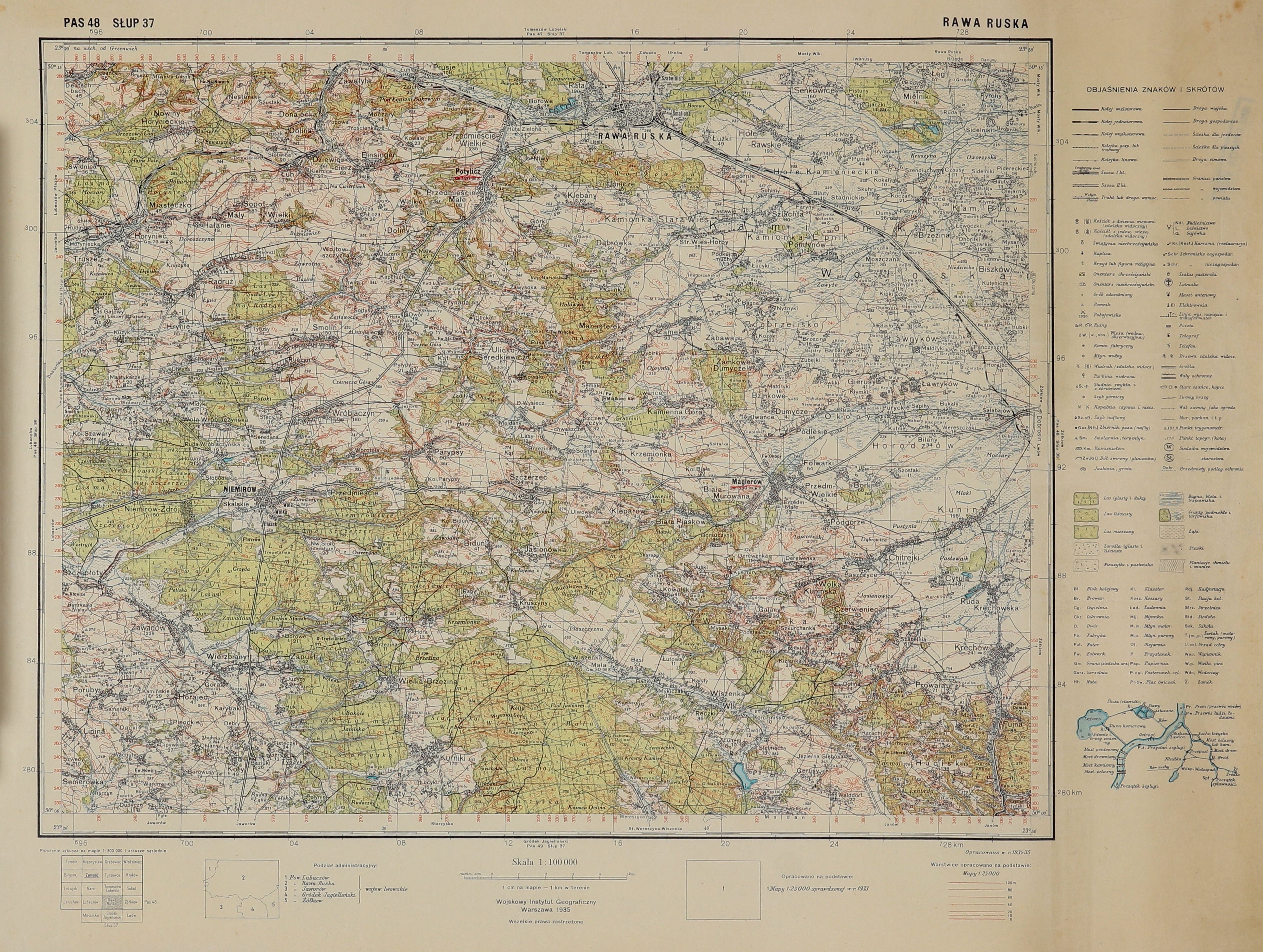 RAWA RUSKA (ukr. Рава-Руська). Mapa okolic Rawy Ruskiej; Wojskowy Instytut Geograficzny, 1935; skala 1 : 100 000; na verso pieczęć składnicy map; druk kolor., st. bdb., zagięcia, zabrudzenia; wym. arkusza 497x378 mm; RAWA RUSKA.