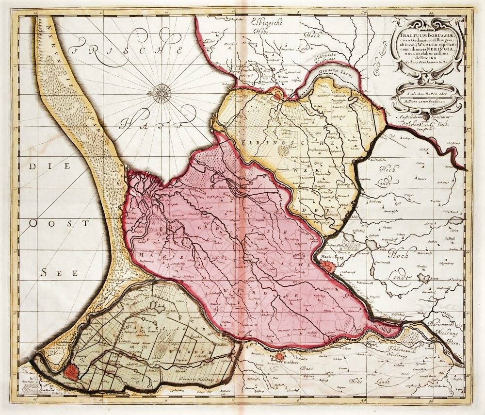 PRUSY KRÓLEWSKIE, ŻUŁAWY WIŚLANE, GDAŃSK, ELBLĄG. Mapa Żuław Wiślanych ze schematycznymi planami Gdańska, Malborka, Tczewa i Elbląga; różnymi kolorami oznaczono Żuławy Gdańskie, Malborskie i Elbląskie; oprac. dla celów wojskowych przez szwedzkiego kartografa wojskowego Olausa Johannesa Gothusa (Olafa Hansona Svarta) w okresie wojny trzydziestoletniej; pierwszy raz wyd. przez Johannesa Janssoniusa w 1641 r., ten egzemplarz wyd. Petrus Schenk i Gerard Valck (pod kartuszem tyt. nota wyd.: Amstelodami Venditant P. Schenk, et G. Valk. Cum Priv.), Amsterdam po 1686, orientacja wschodnia; miedz. kolor., st. bdb., na verso miejscowo podklejenia papierem, ślady wilgoci; wym. płyty 480x410 mm; TRACTUUM BORUSSIAE, circa Gedanum et Elbingam […]; [por. Dantiscum... G81/1, ale inny wydawca, a sygn. wydawcy pod kartuszem tyt., a nie nad dolną ramką].