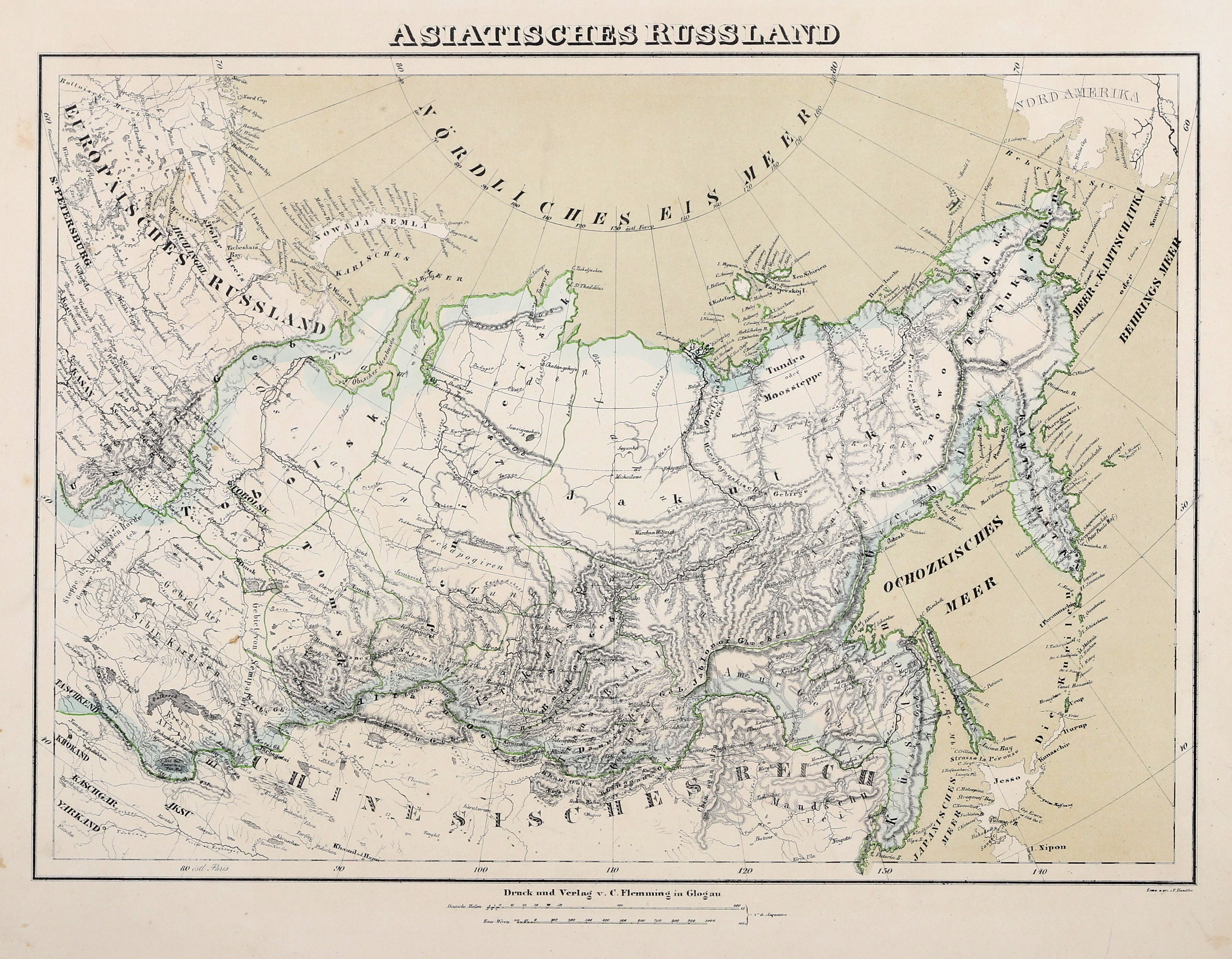 ROSJA. Mapa azjatyckiej części Rosji; ryt. F. Handtke, druk. i wyd. C. Flemming, ok. 1860.