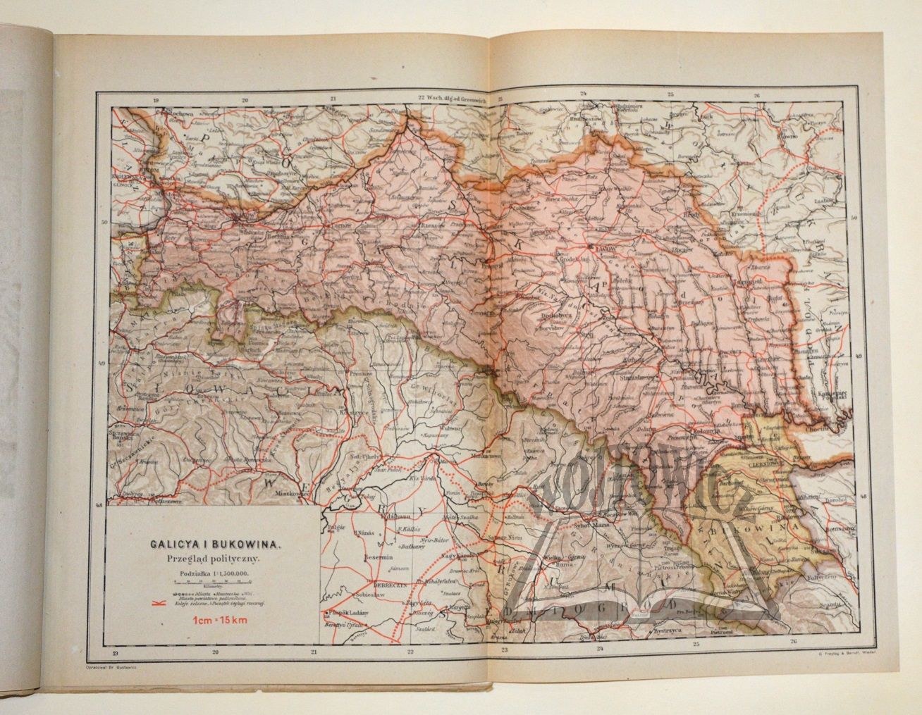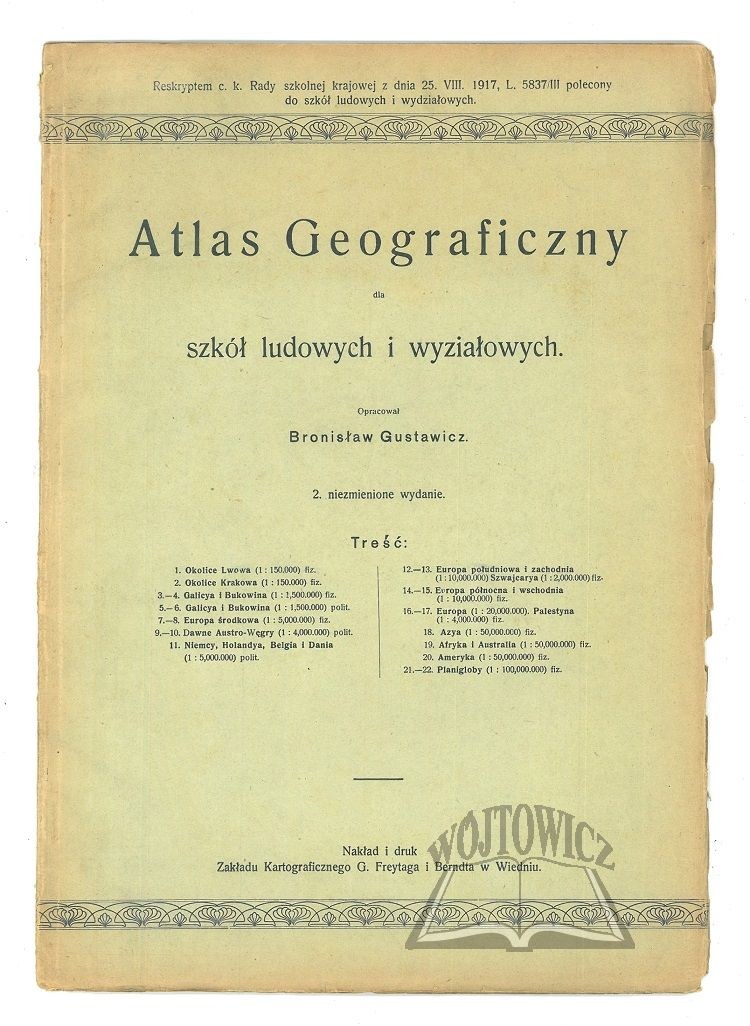 Oprac. ... 2 niezmienione wydanie. Wiedeń 1917. Nakł. i druk Zakładu karograf. G. Freytaga i Berndta. 4, 14 map (w tym kolor. i skład.; komplet), okł. brosz. oryg. Reskryptem c.k. Rady szkolnej krajowej z dnia 25.VIII.1917 ...