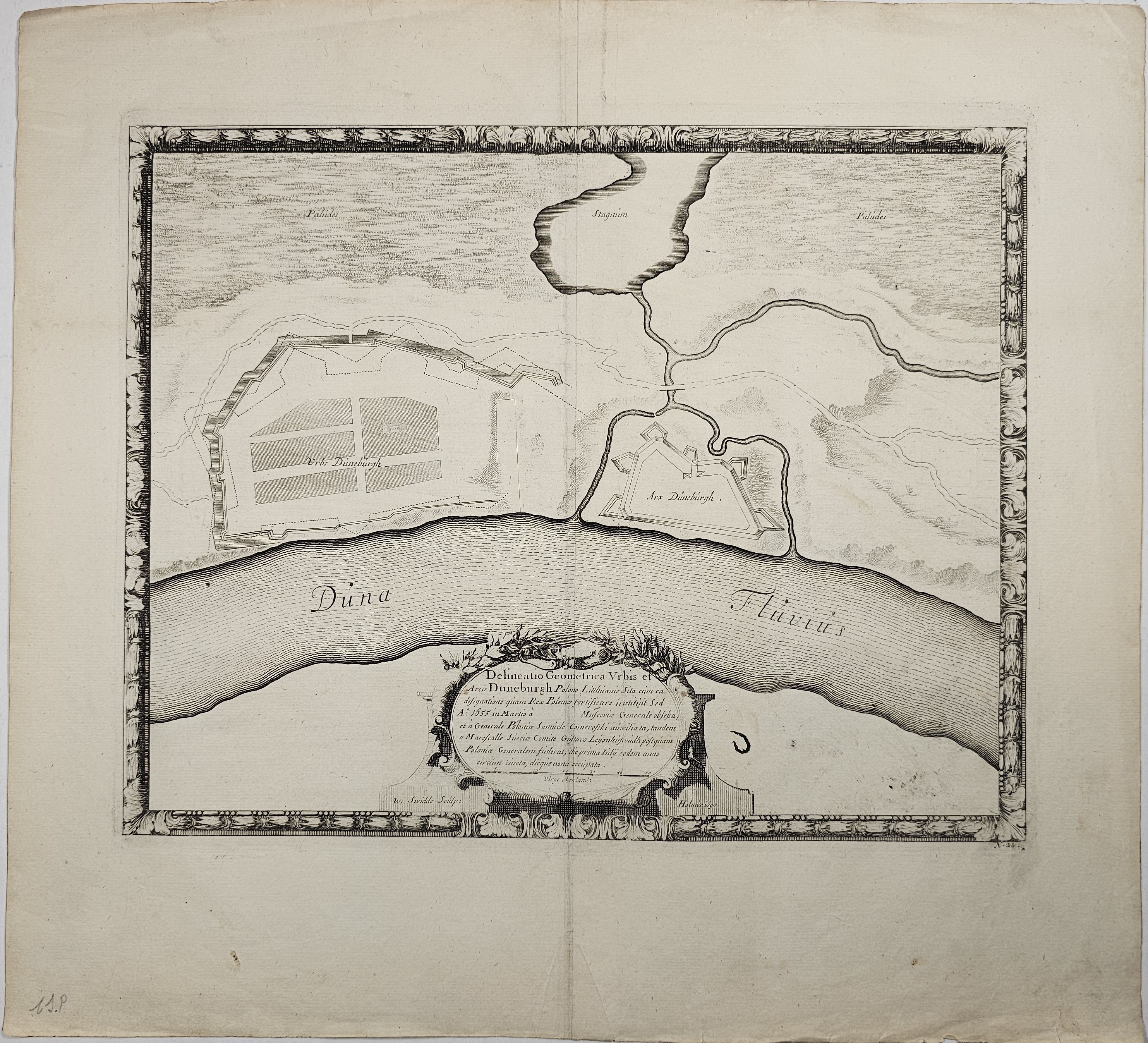 Plan umocnień miasta. Szwedzi rozpoczęli wojnę ["Potop szwedzki"] zajmując Dyneburg; wykorzystując walkę Rzeczypospolitej z Moskwą Karol Gustaw wkroczył do Inflant. Miedzioryt, sygn.: W. Swidde sculp. Holmiae [Sztokholm] 1690. Tytuł w kartuszu w dole. Wym.: 24 x 30,5 cm. Rycina z dzieła Puffendorfa: De rebus a Carolo Gustavo. .. Norimb. 1696