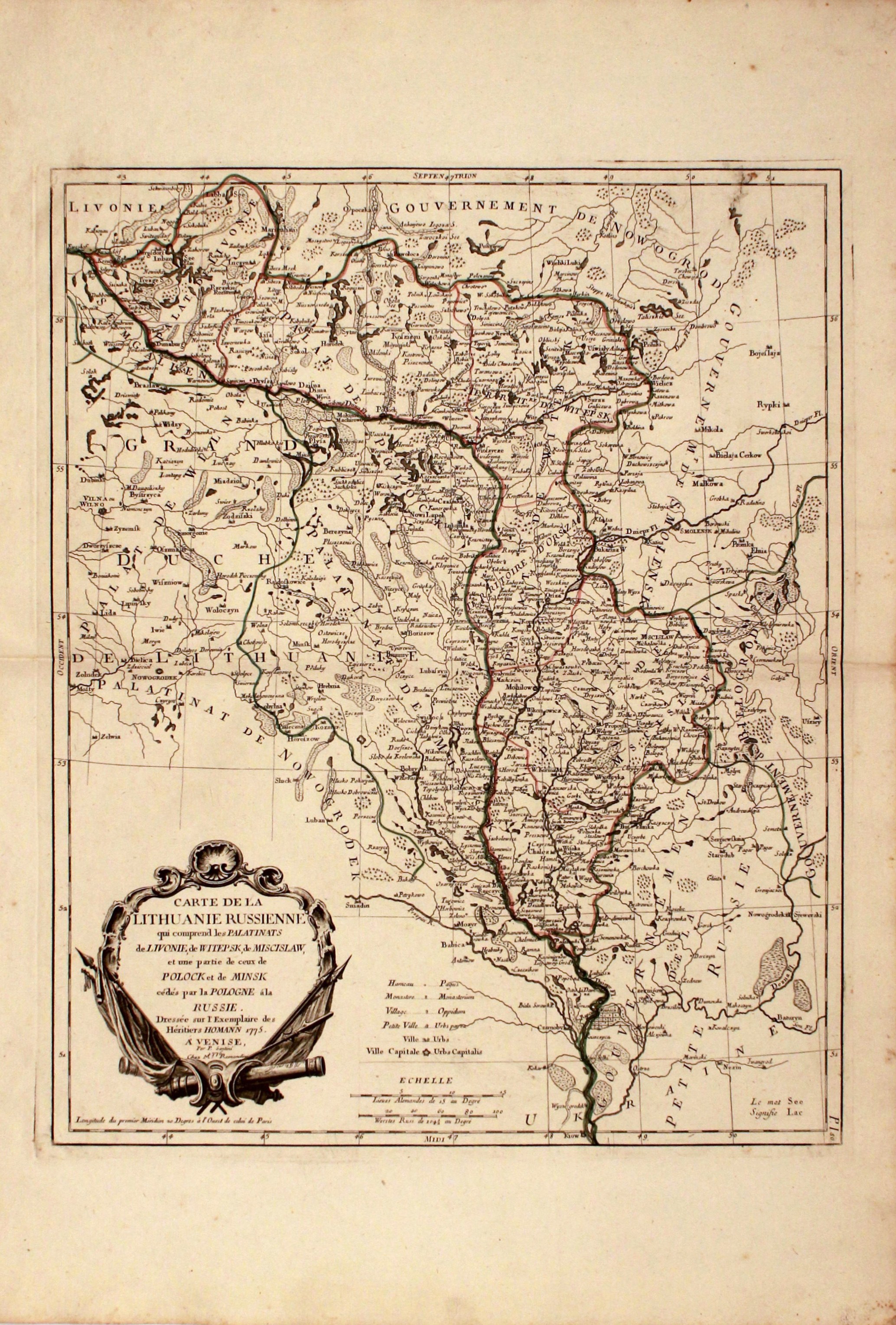 LITWA. Mapa ziem odebranych Wielkiemu Księstwu Litewskiemu przez Rosję po I rozbiorze; na podstawie mapy z Oficyny Spadkobierców Homanna 1775; ryt. Paolo Santini, wyd. G.A. Remondini, Paryż 1776; miedz. cz.-b. z kolorem liniowym, st. bdb., niewielkie rdzawe zabrudzenia na marginesach; wym. płyty: 455x560 mm; CARTE DE LA LITHUANIE RUSSIENNE qui comprend les PALATINATS de LIVONIE, de WITEPSK, de MISCISLAW, et une partie de ceux de POLOCK et de MINSK…;