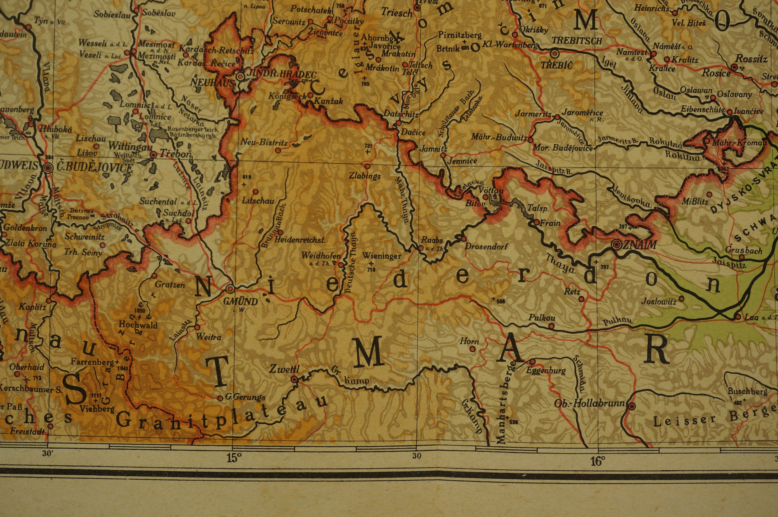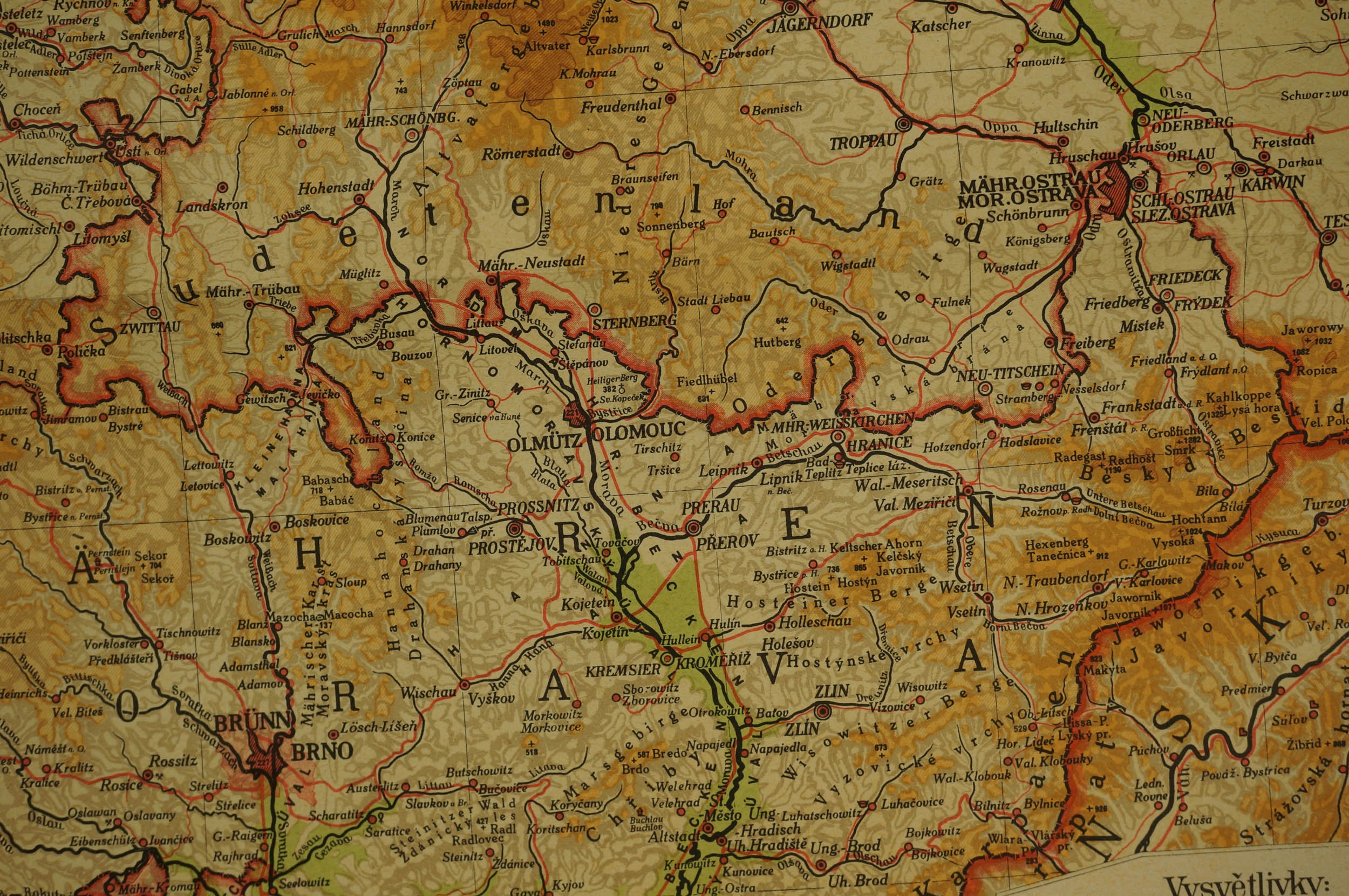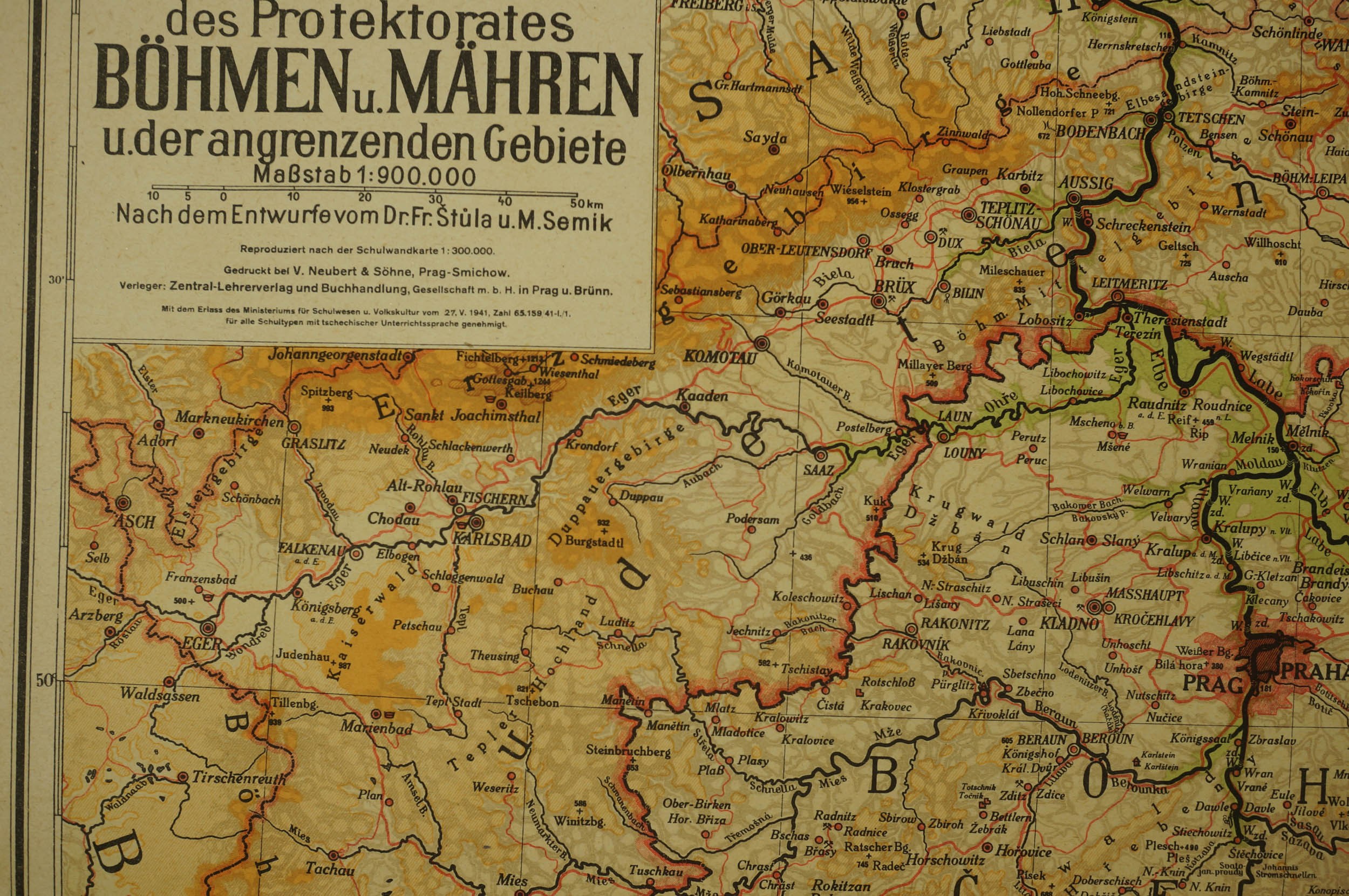 Mapa szkolna Rzeszy Niemieckiej i Protektoratu Czech i Moraw oraz sąsiednich obszarów [Deutsche Reich Schulhandkarte des Protektorates Böhmen und Mähren u. der angrenzenden Gebiete], [przed 1945r.], skala 1:900.000, według projektu dr Fr. Stula M. Semik, Verlag: Zentral Lehrerverlagund Buchhandlung Geselschaft m.b.H., Prag u. Brünn, f. 60x38cm