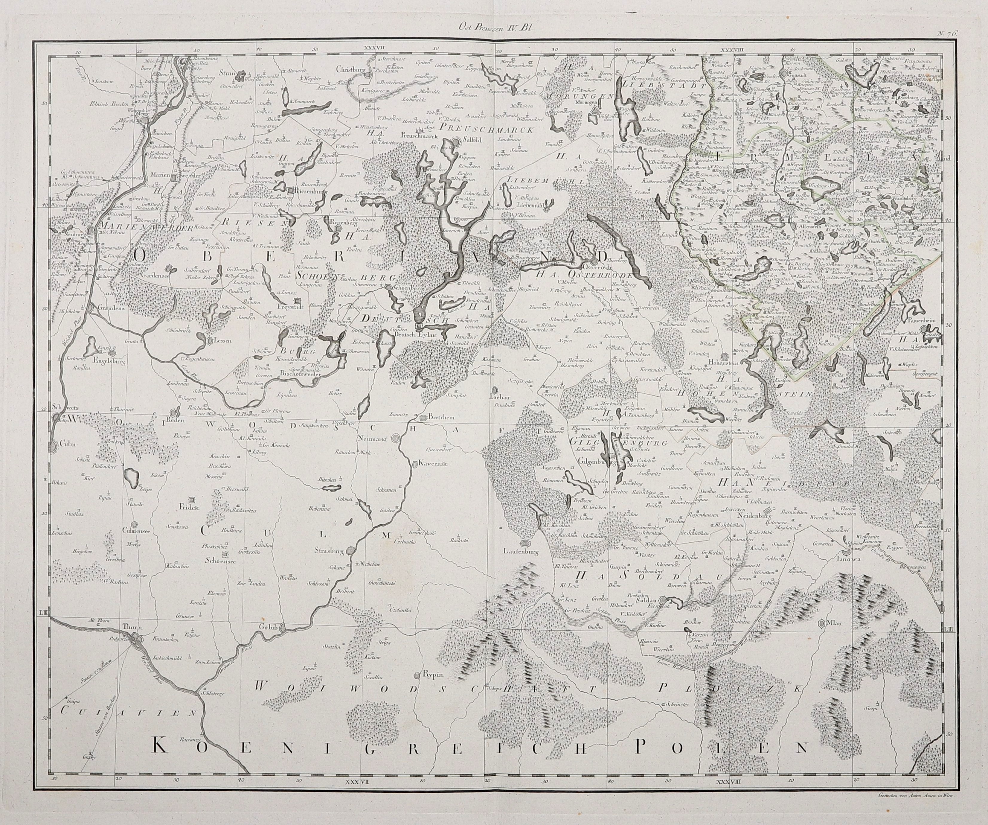 POJEZIERZE IŁAWSKO-OSTRÓDZKIE. Mapa Pojezierza Iławsko-Ostródzkiego – IV arkusz mapy Prus Wschodnich; ryt. A. Amon, pochodzi z: F.A. Schraembl, Allgemeiner Grosser Atlass, wyd. P.J. Schalbacher, 1787–1788; podpisane następujące jeziora: Dzierzgoń (Sorge See), Gaudy (Gaudetiz See), Ewingi (Ebing See), Płaskie (Flach See), Jeziorak (Ieserich S.), Gil Wielki (Gr. Geilen See), Łabędź (Laben See), Trupel (Traupel See), Karaś (Scharst S.), Drwęckie (Drebenitz See), Szeląg Wielki (Schilling See), Narie (Nargen See), Łęgnowskie (Lingnau See), Sunia (Zaun See), Limajno (Leimangel See), Blanki (Blanken See), Wadąg (Wadung See), Ukiel (Okell S.), Wulpińskie (Thomsdorf See), Klebarskie (Ameluk S.), Kośno (Rochno See), Pluszne Wielkie (Plautzig See), Łańskie (Lanska See), Leleskie (Leleske S.), Dąbrowa Wielka (Damerau See); miedz. cz.-b. z kolorem liniowym, st. bdb., minimalne naddarcie; wym. płyty 602x494 mm; Ost Preussen IV. Bl.; [Von Danzig 221].