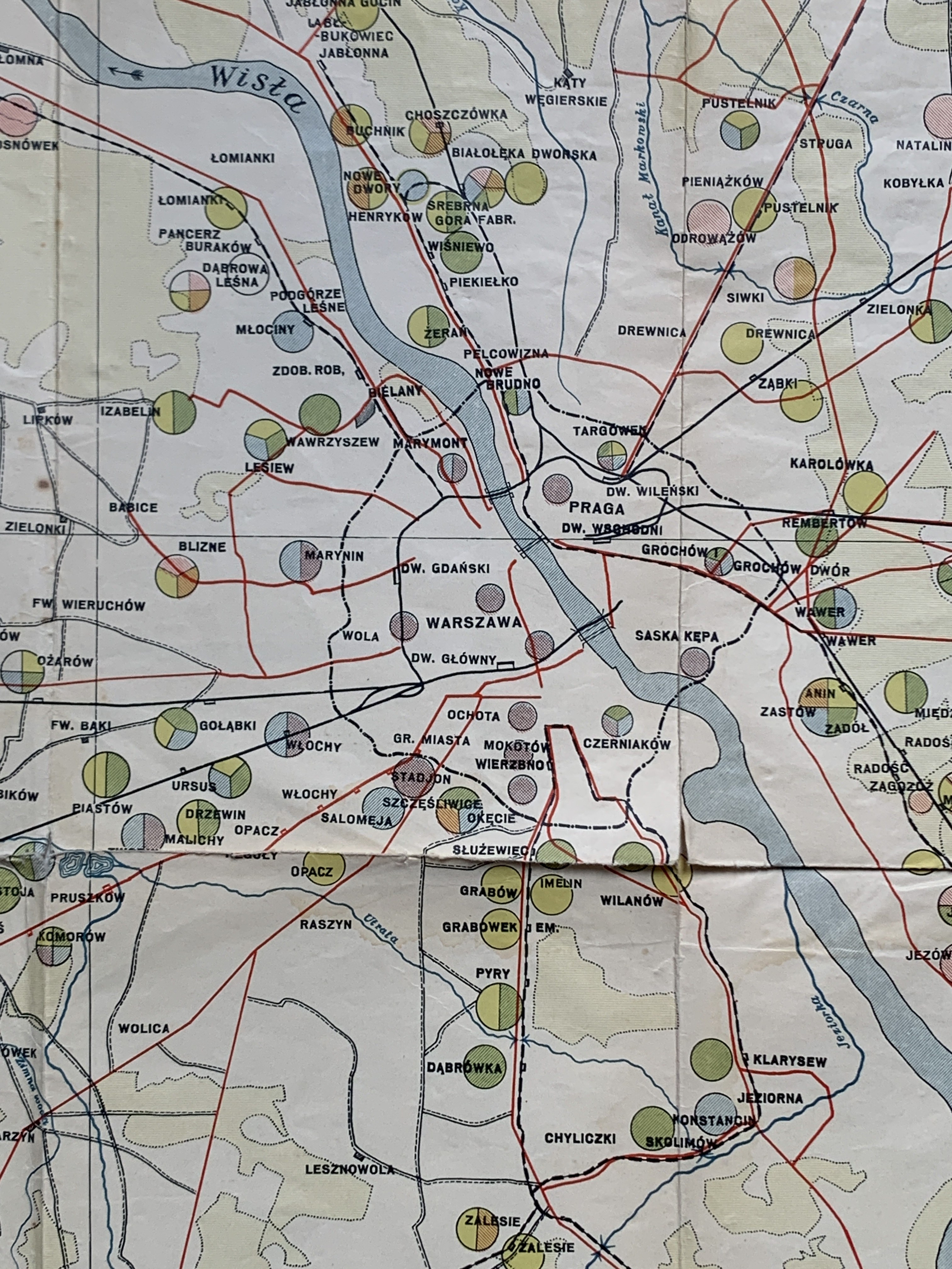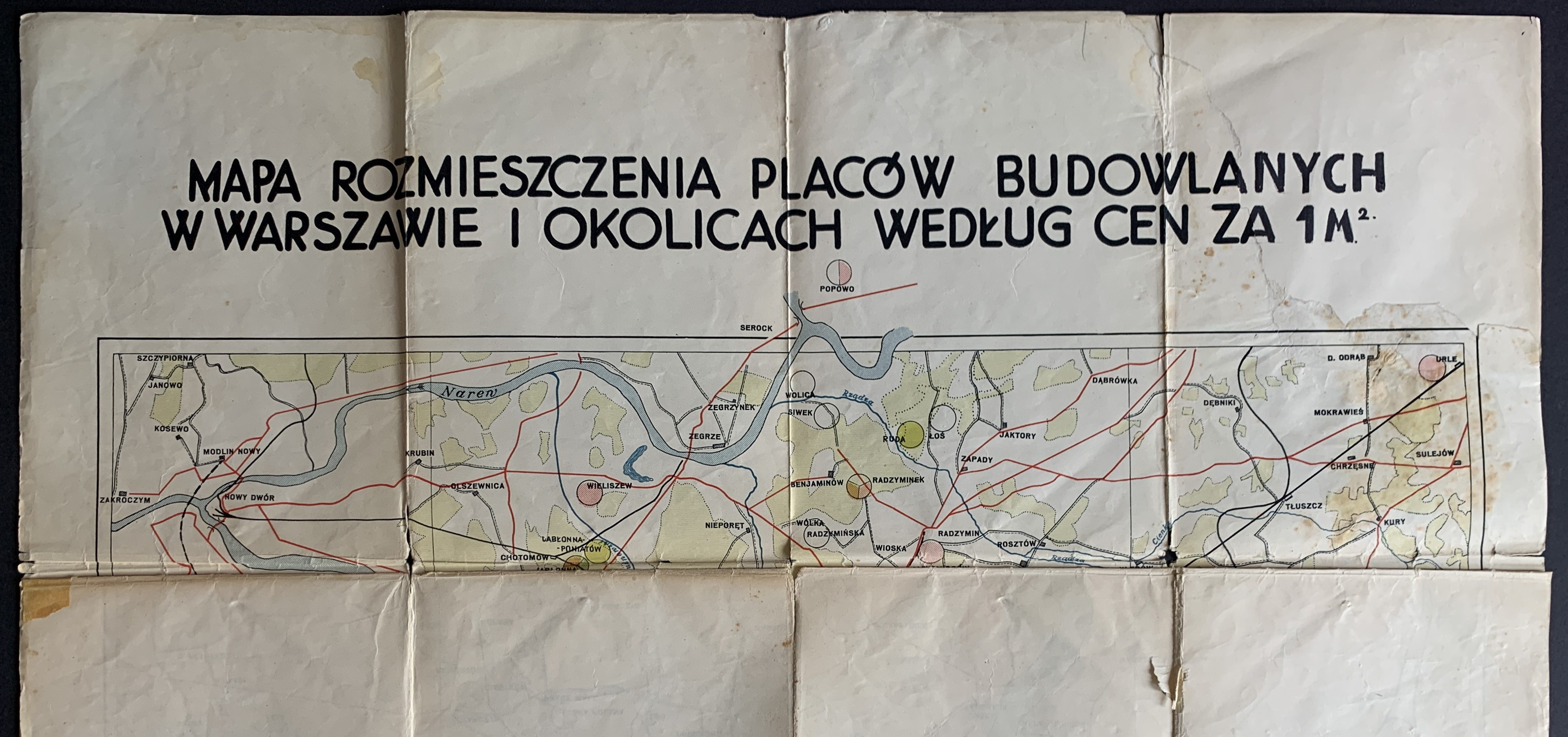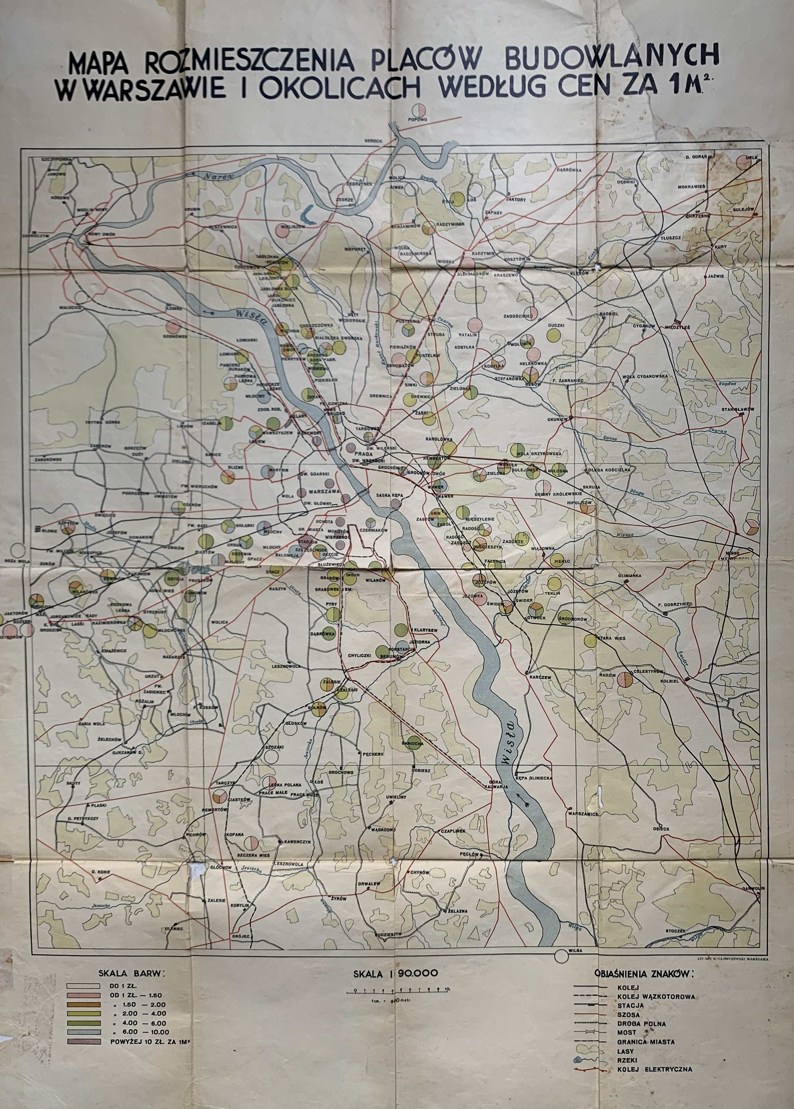 [WARSZAWA] MAPA rozmieszczenia placów budowlanych w Warszawie i okolicach według cen za 1m². Nakł. miesięcznika Osiedle Dom Mieszkanie. [1931].