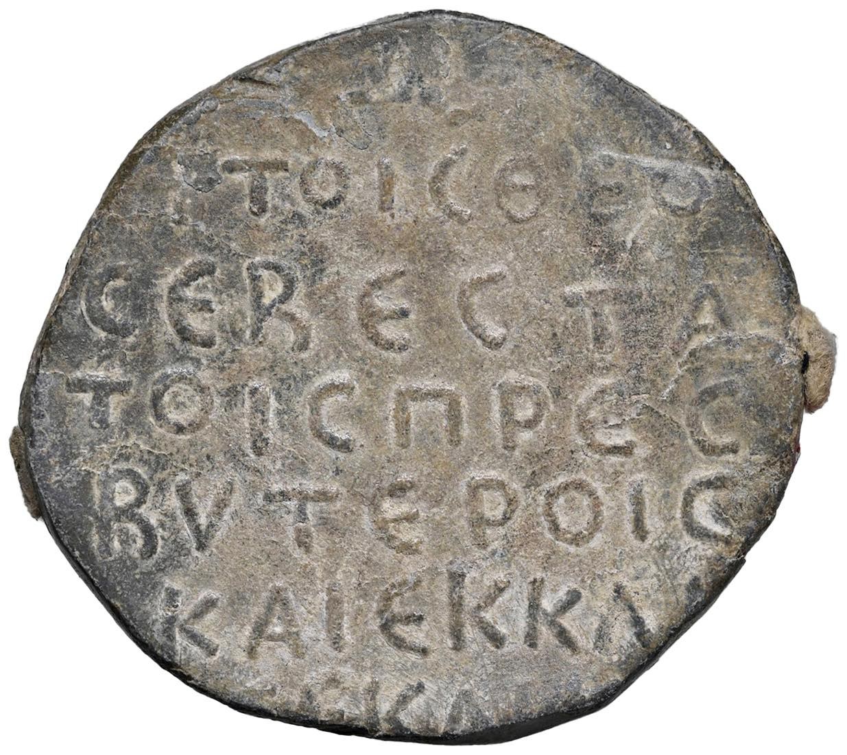 COSTANTINOPOLI Bolla plumbea Consacrazione della basilica di Santa Sofia di Costantinopoli (XI-XII sec.) D/ L'imperatore Giustiniano I dona la chiesa, dedicata a Santa Sofia, alla Vergine. R/ Scritta in caratteri greci che si può tradurre come "Santissima madre di Dio, aiuta i più venerabili sacerdoti e giudici di Santa Sofia" - PB (g 84 - Ø 46 mm) RRRR