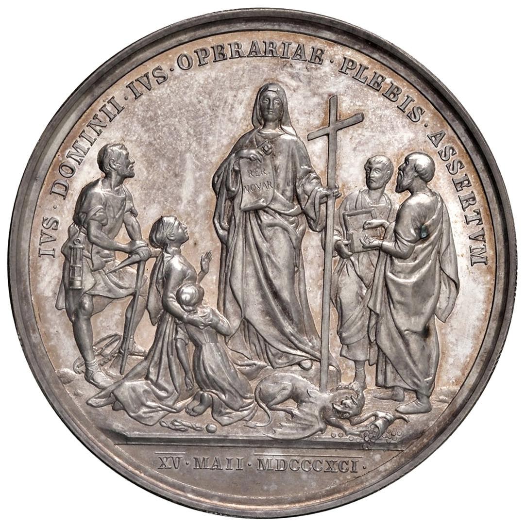Leone XIII (1878-1903) Medaglia annuale 1891 An. Personificazione della chiesa tra operai e padroni - Opus: F. Bianchi - Mont. 41 AG (g 36,26 - Ø 43,7 mm)