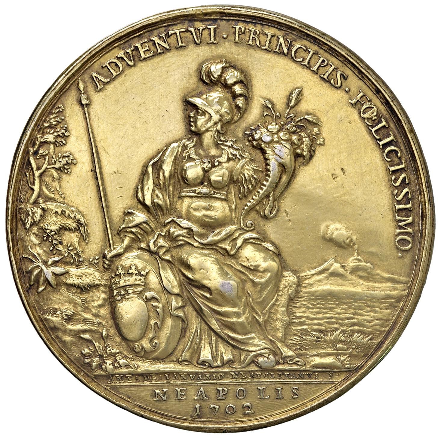 NAPOLI Filippo V di Spagna Medaglia 1702 Visita del re a Napoli - Opus: A. De Gennaro - Siciliano 69; Collezione Johnson 310 AG dorato (g 82,48 - Ø 58 mm) RR Colpo al bordo, appiccagnolo rimosso.