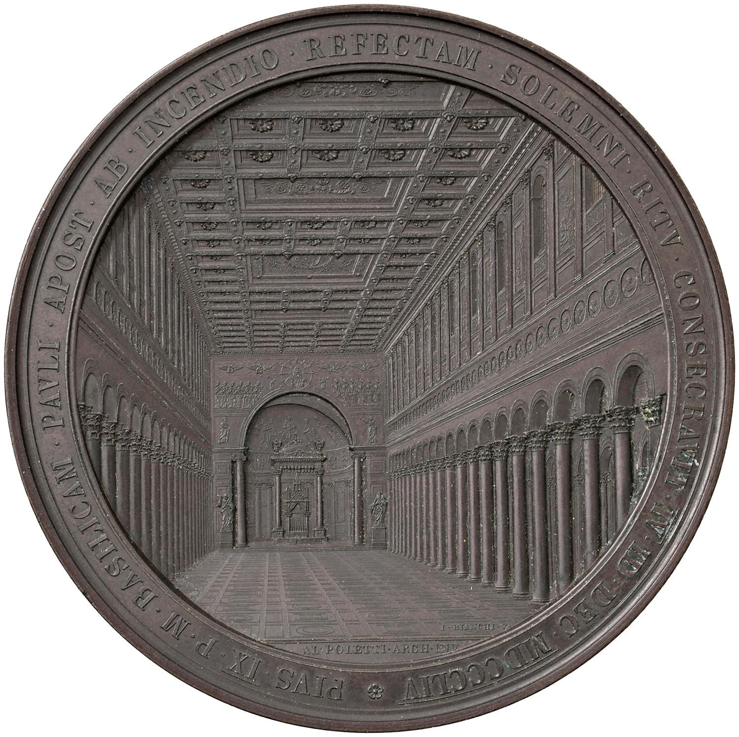 Pio IX (1846-1878) Medaglia coniata di grande modulo 1854 - Restauri alla basilica di San Paolo fuori le mura, vista prospettica dell'interno della basilica - Opus: G. Bianchi - Bart. 6 AE (g 260 - Ø 82 mm) R Segnetti nel campo al D/. Patina scura.