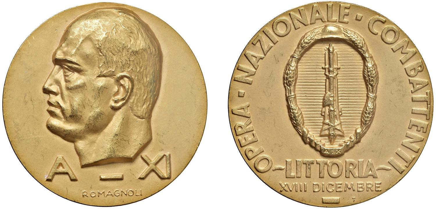 Ventennio Fascista (1922-1943) Medaglia An. XI dell'Era Fascista 1932 O.N.C. Opera Nazionale Combattenti - INAUGURAZIONE DI LITTORIA (l’attuale città di Latina) - Opus: G. Romagnoli Regia Zecca - Casolari XI.38; R.Z. p. 111, 56 AU+Z coronata (g 92,63 - Ø 45,31 mm) RRRRR Della più grande rarità. Pregevole medaglia in oro in cofanetto, con impressione dorata. "L’Opera Nazionale Combattenti fu formalmente istituita, con decreto luogotenenziale 10 dicembre 1917, n° 1970. L'O.N.C. con il Commissario Governativo On. Valentino Orsolini Cencelli, appoggiata dal duce, diedero vita ad una delle più grandi opere di bonifica, ed all'inaugurazione di Latina, Sabaudia e Pontinia". Questa pregevole e rarissima medaglia è sicuramente una delle pochissime medaglie d'oro "sopravvissute" ed a noi giunte.