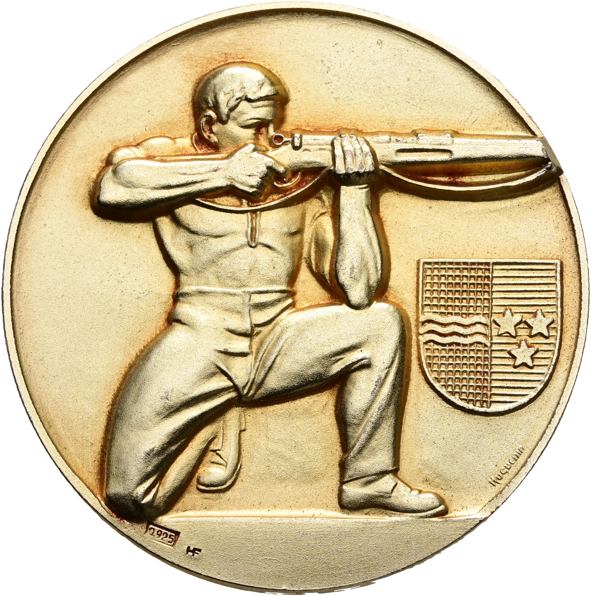 Vergoldete Silbermedaille des Aargauischen kantonalen Kleinkaliberschützenverbands, Obligatorisches Programm (entspricht Richter 54a, jedoch in Silber, extrem selten / corresponds to Richter 54a, but in silver; extremely rare).