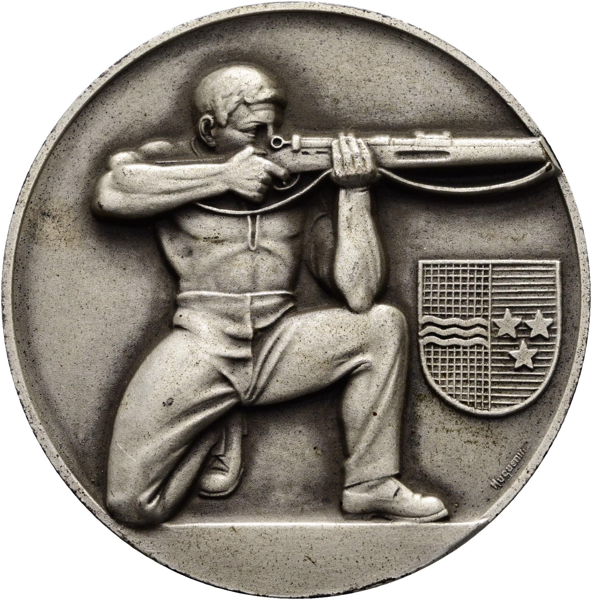 Versilberte Bronzemedaille des Aargauischen kantonalen Kleinkaliberschützenverbands, Obligatorisches Programm (Schützenmedaillen Richter 54b; Jahrgang dieses Exemplars im Katalog unbekannt / Year of this specimen unknown in the catalogue).