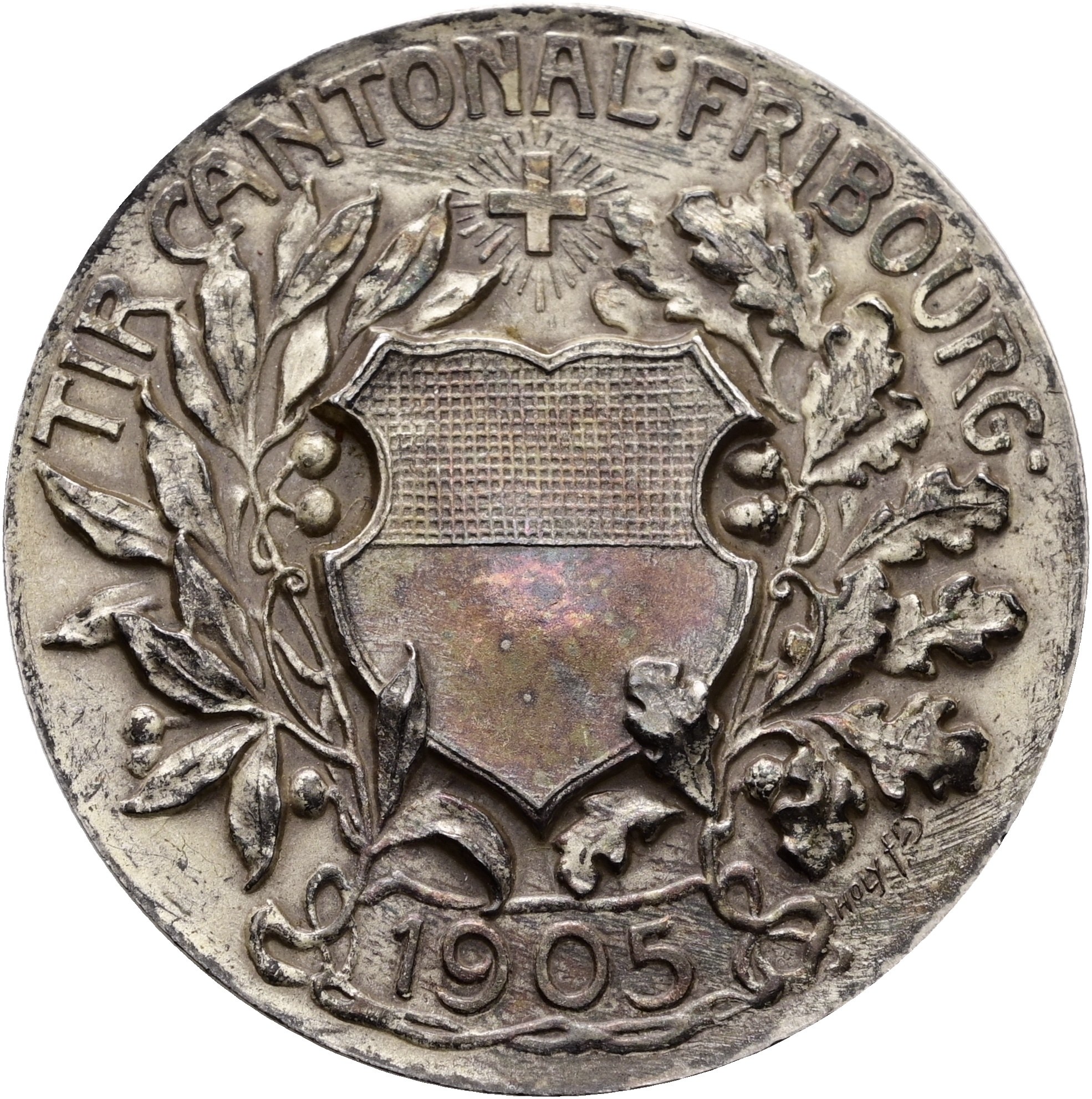 Silbermedaille auf das Freiburger Kantonalschützenfest 1905 – Tir cantonal Fribourgeois (Schützenmedaillen Richter 420a).