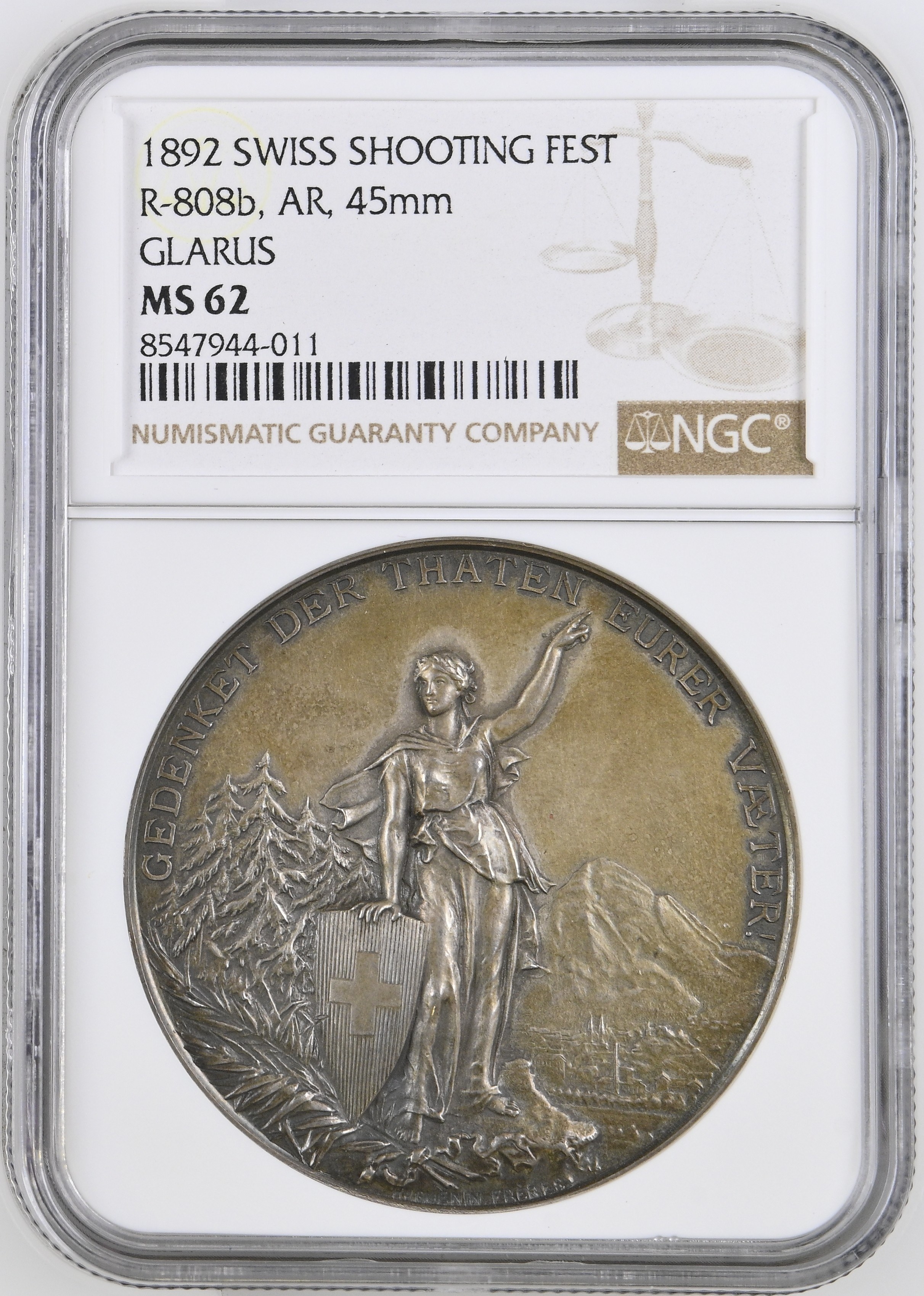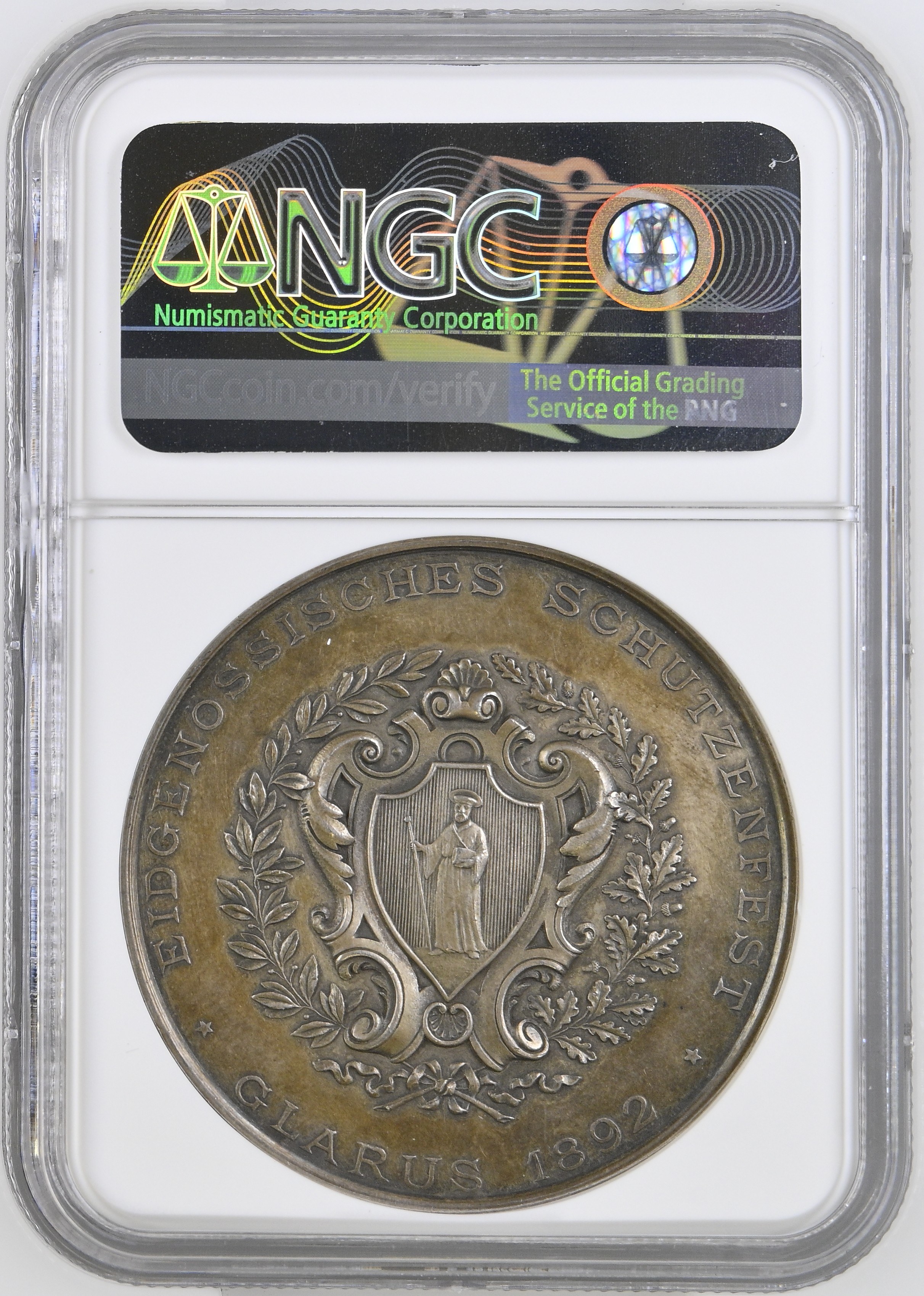 Silbermedaille auf das Eidgenössische Schützenfest in Glarus 1892 (Schützenmedaillen Richter 808b). Bewertet von NGC mit MS 62.