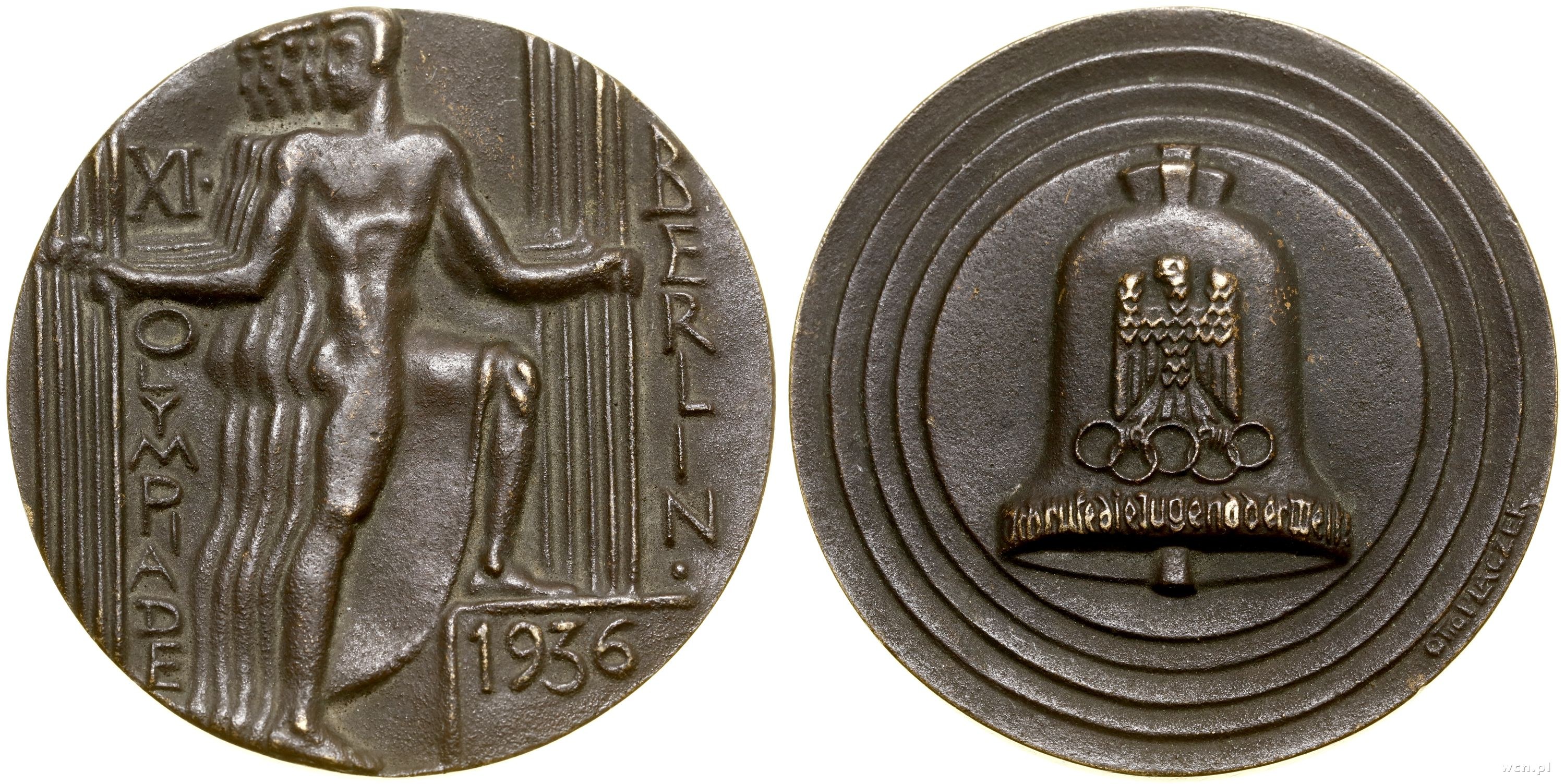Aw: Zwielokrotniona postać idąca w prawo, z głową w lewo, XI• / OLYMPIADE - BERLIN• / 1936, Rw: Dzwon, na nim orzeł trzymający koła olimpijskie oraz napisem Ich rufe die Jugend der Welt, z prawej sygnatura OTTO PLACZEK