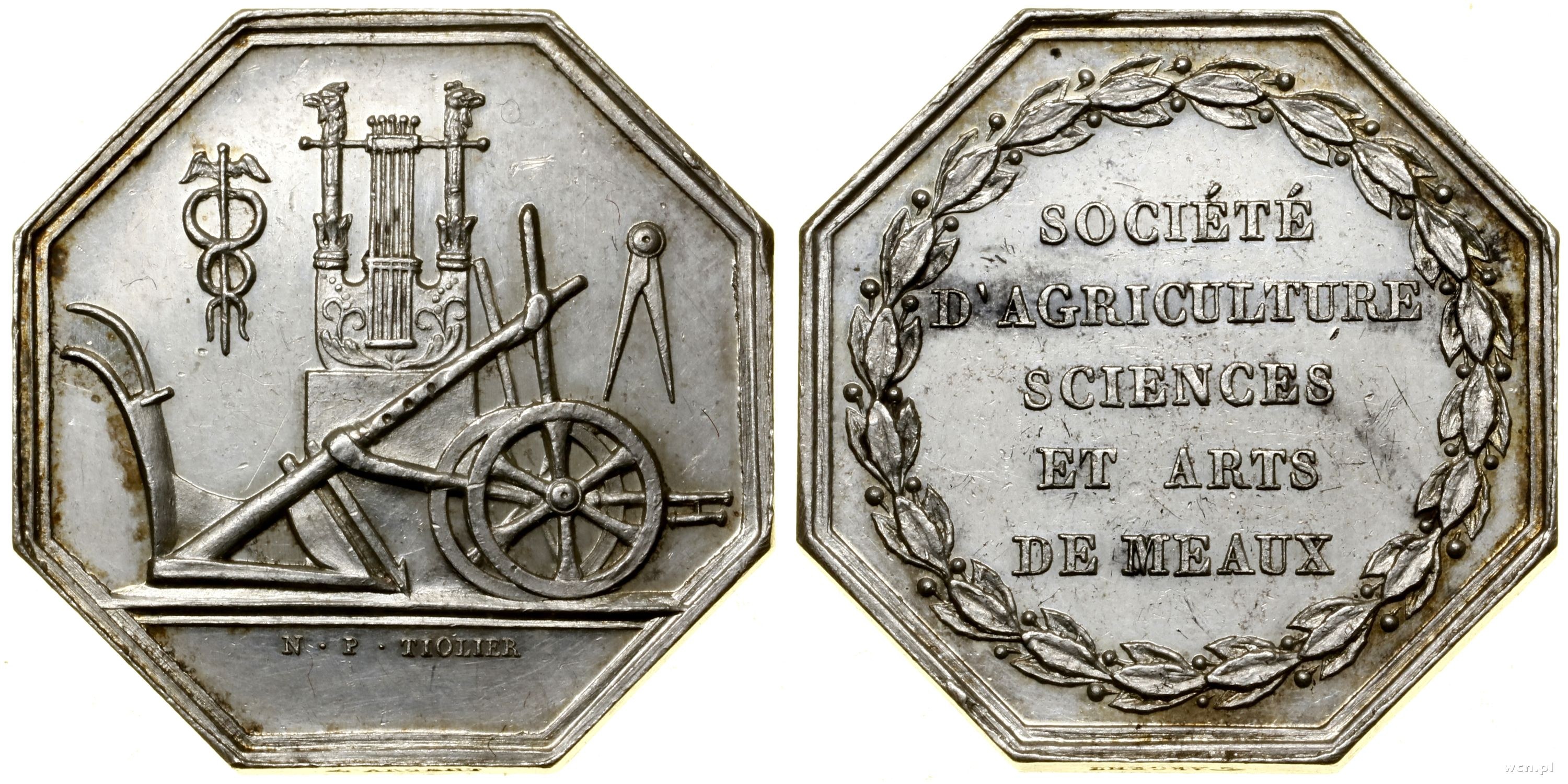 Aw: Pług, za nim lira, kaduceusz i cyrkiel, na dole sygnatura N • P • TIOLIER, Rw: Wieniec, w którym SOCIÉTÉ / D' AGRICULTURE / SCIENCES / ET ARTS / DE MEAUX, Obrzeże: Punca ARGENT
