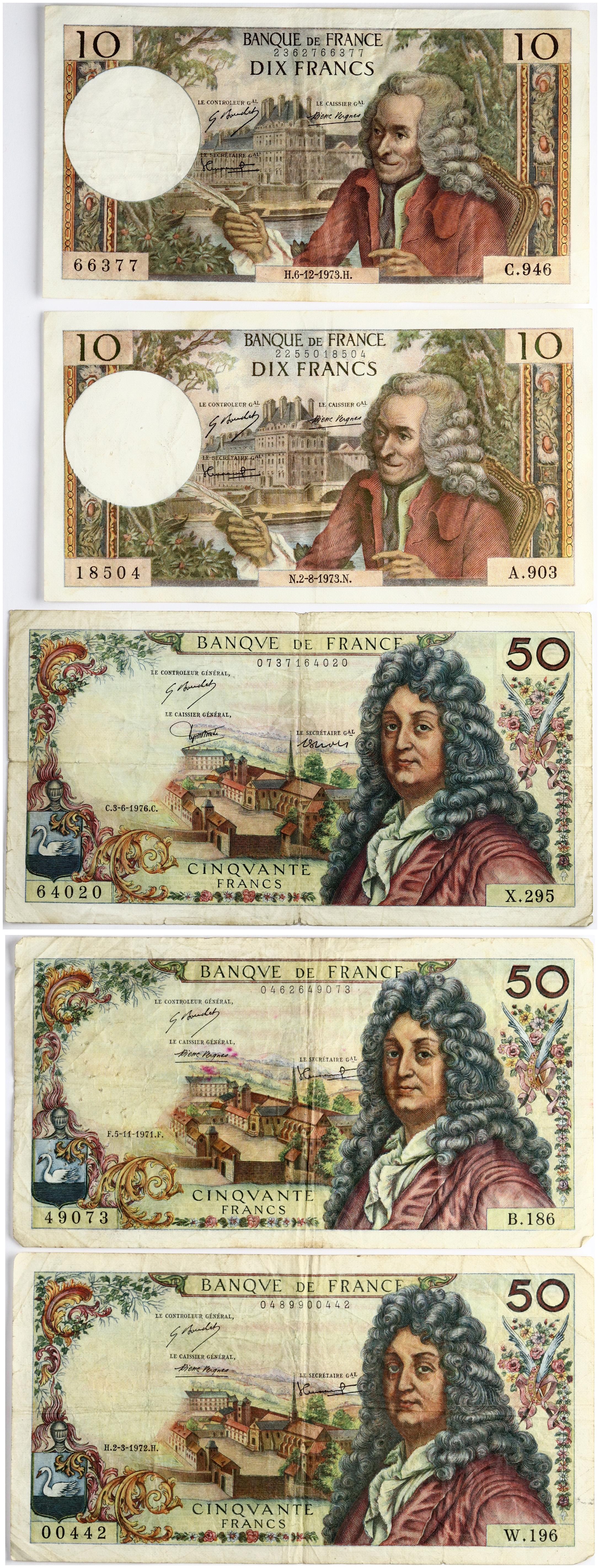France. 10 & 50 Francs (1971-1976). Lot of 5 pcs.