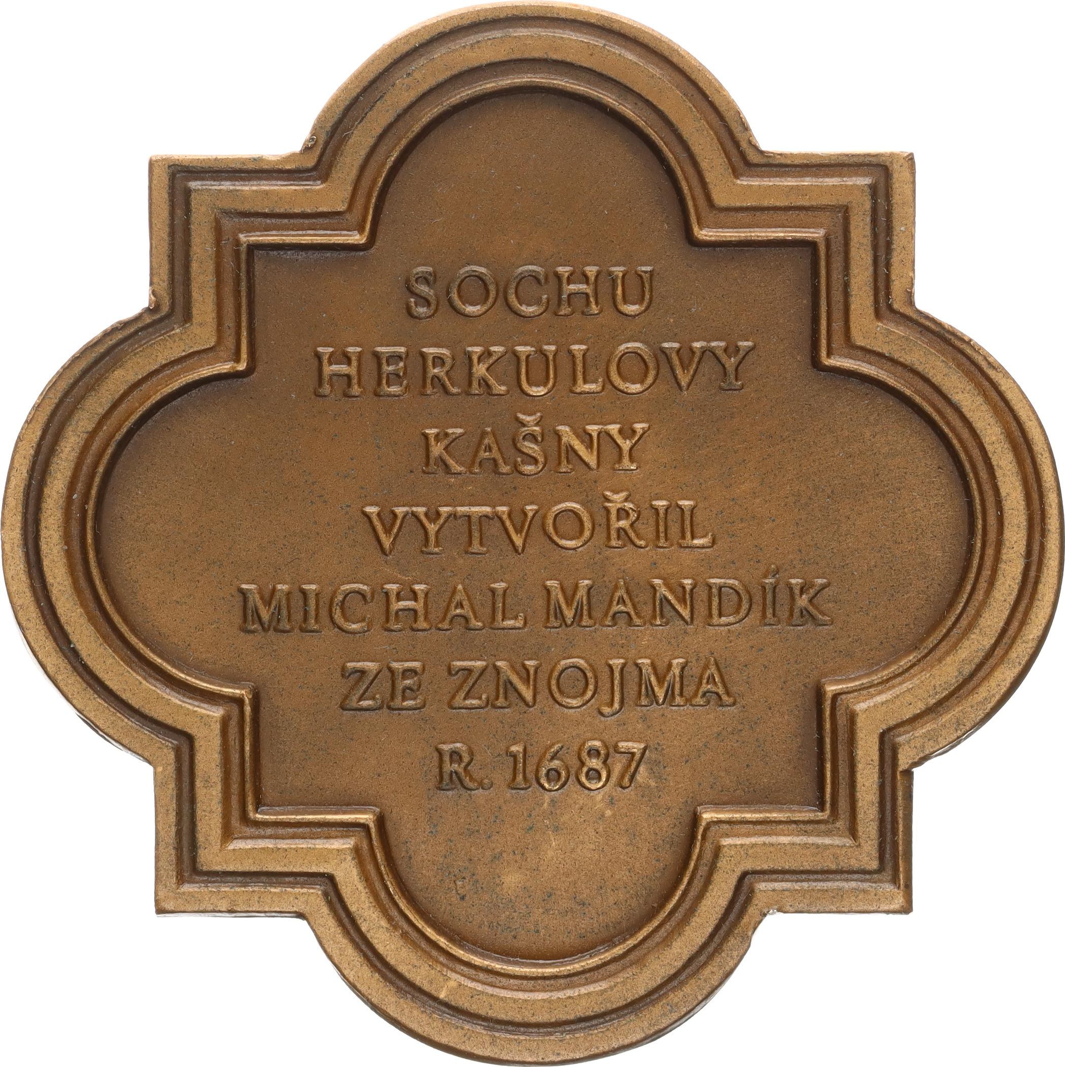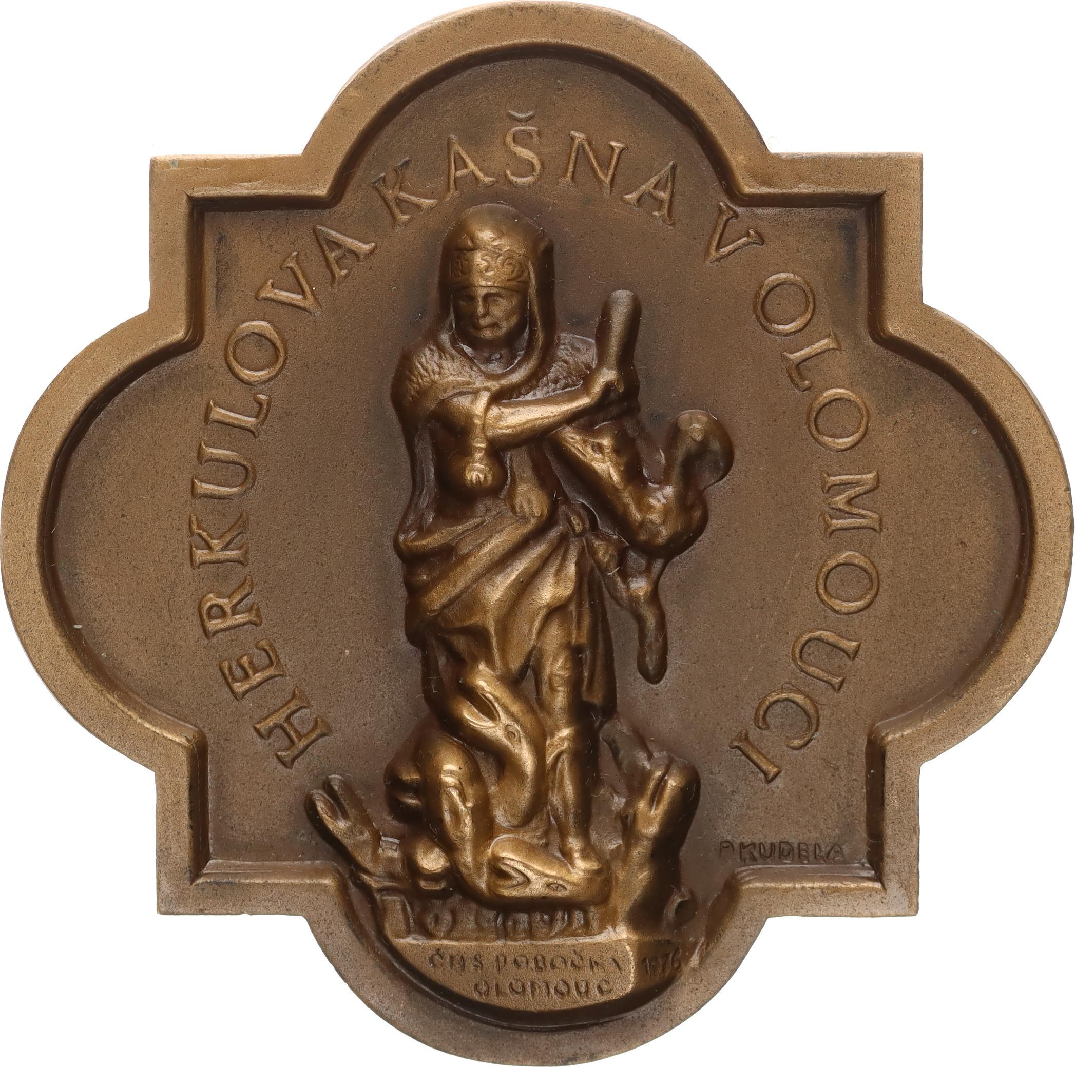 Herkulova kašna, vyobrazení sochy na kašně / 7-mi řádkový nápis sign.: P. KUDELA vydala pobočka CNS v Olomouci r. 1976 bronz ve tvaru půdorysu kašny 71 mm 173,5 g (300 ks) BK 28/22