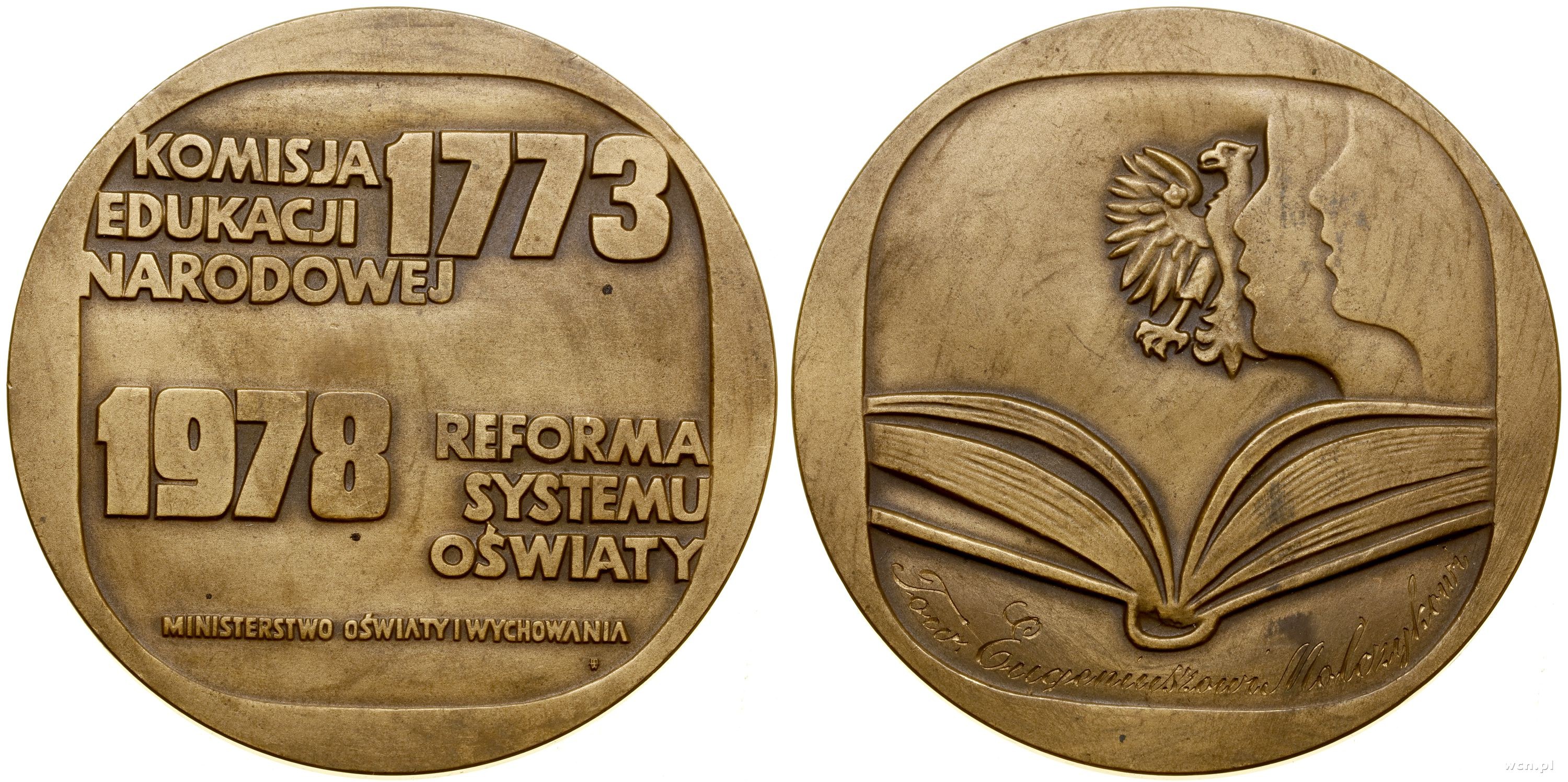 Aw: KOMISJA / EDUKACJI / NARODOWEJ - 1773 / 1978 - REFORMA / SYSTEMU / OŚWIATY / MINISTERSTWO OŚWIATY I WYCHOWANIA, Rw: Dwie głowy dziecięce w lewo, w tle Orzeł, niżej otwarta książka, niżej wygrawerowane Tow. Eugeniuszowi Malczykowi, projektował Jan Sarnecki