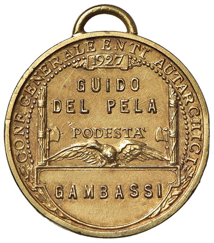 SAVOIA. Durante Vittorio Emanuele III (1900-1943) Medaglia coniata in oro 1927 Al Podestà Guido Del Pela, Gambassi - CONFEDERAZIONE GENERALE ENTI AUTARCHICI - Opus: senza firma - AU (g 7,52 - Ø 23,8 mm) R