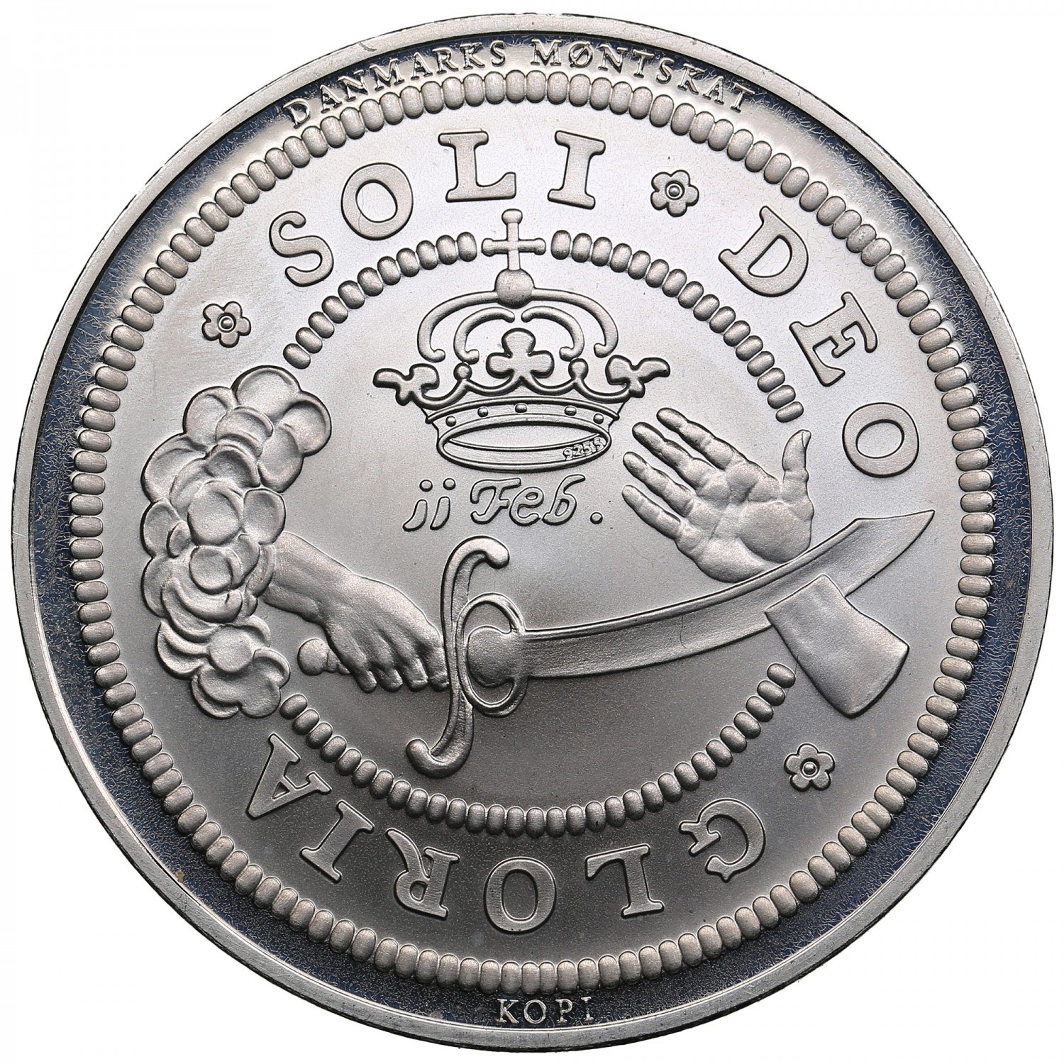 19.96g. Ag 0.925. 39mm. PROOF. Issued as part of the modern commemorative series "Danmarks Møntskat" (Denmark’s Coin Treasure), which reproduces important historical Danish coin types in sterling silver.