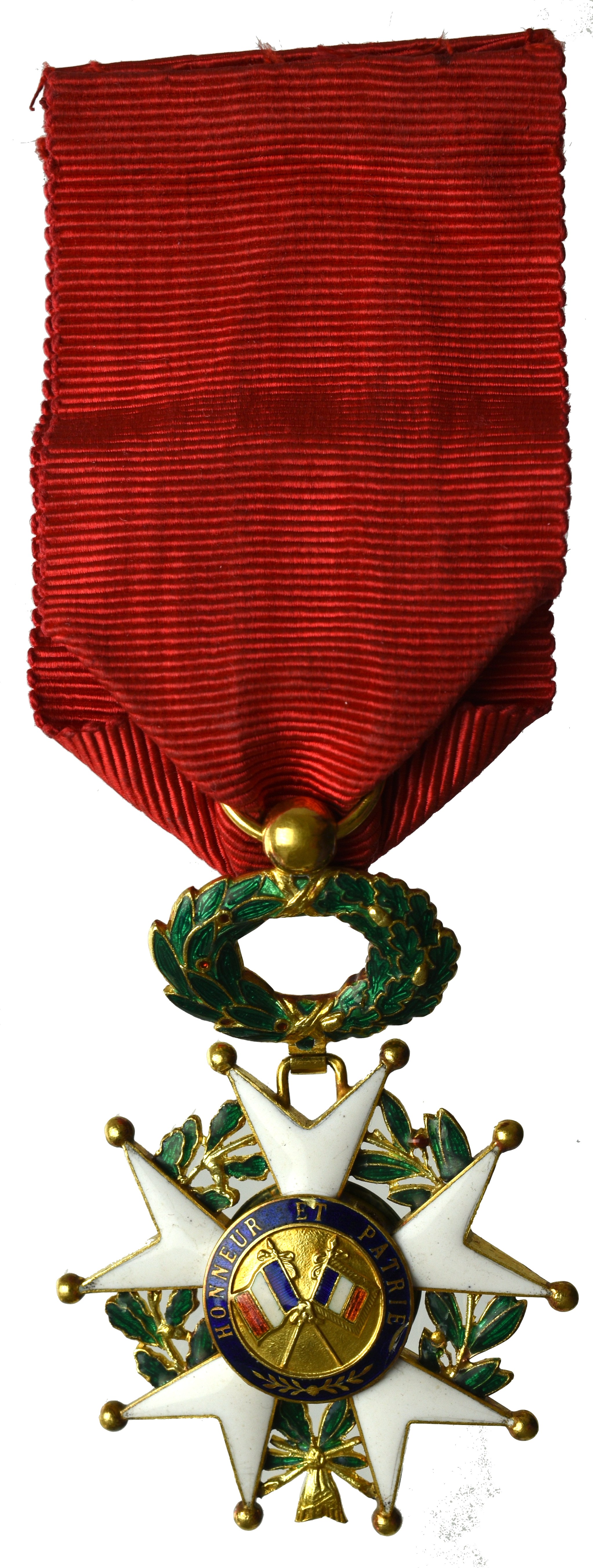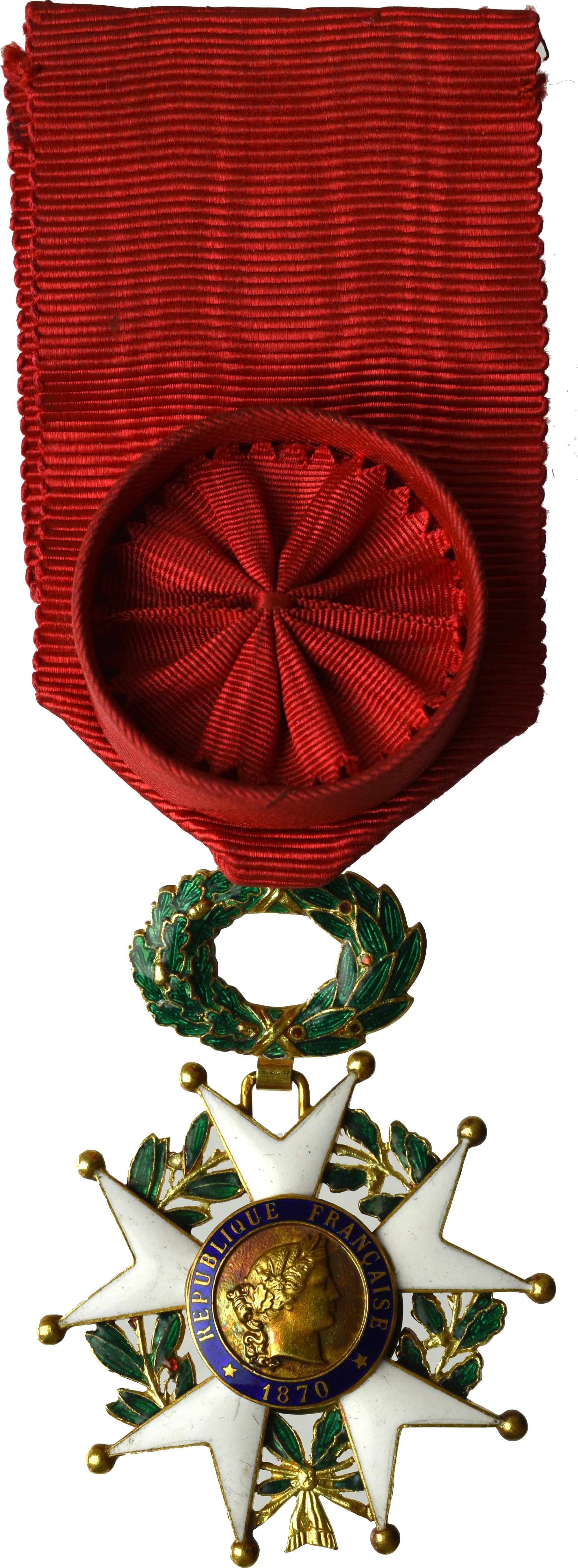 Awers: pięcioramienna gwiazda na wieńcu laurowo-dębowym, centralnie umieszczony medalion z popiersiem Marianny, okolonego emaliowanym na niebiesko okręgiem z legendą REPUBLIQUE FRANCAISE 1870; ucho okolone koroną z koluszkiem. Na wiązaniu wieńca nabita cecha państwowa dla złota;