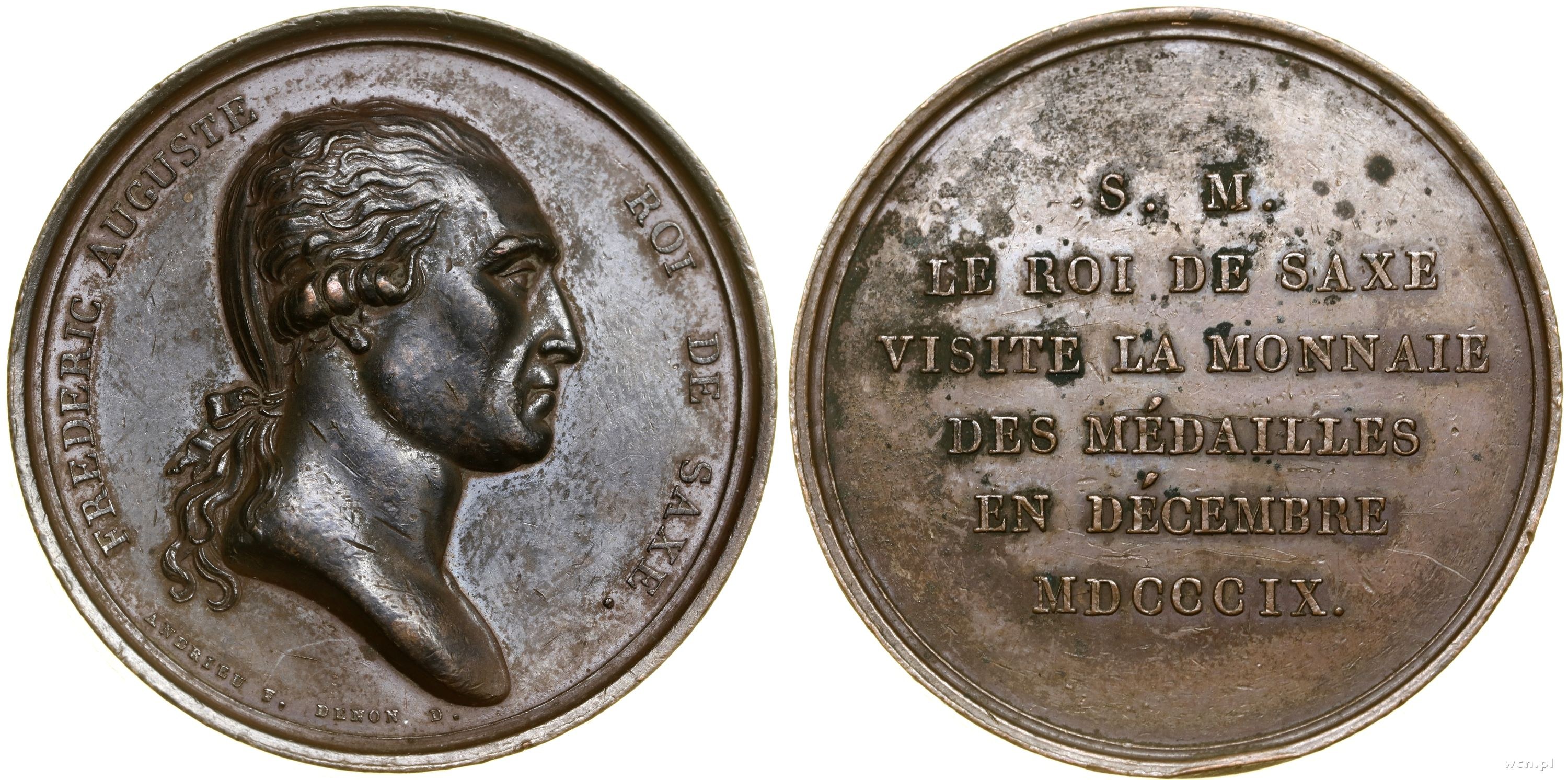 Aw: Głowa w prawo, niżej sygnatura ANDRIEU F. DENON D., FREDERIC AUGUSTE - ROI DE SAXE, Rw: S. M. / LE ROI DE SAXE / VISITE LA MONNAIE / DES MÉDAILLES / EN DÉCEMBRE / MDCCCIX