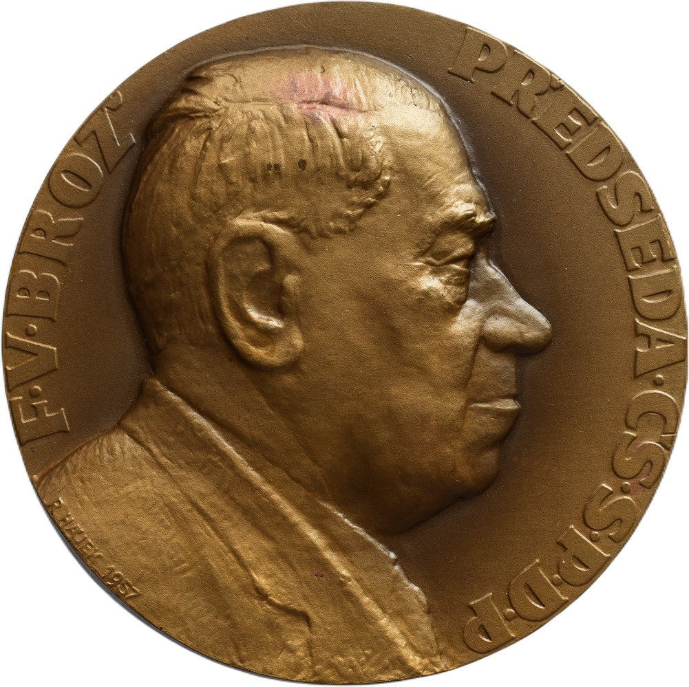Hájek, F.V.Brož - 20.výročí založení Drobné plastiky 1957 - poprsí zprava, opis / pětiřádkový nápis, Sign., patinovaný bronz 60 mm, vl.škr. R