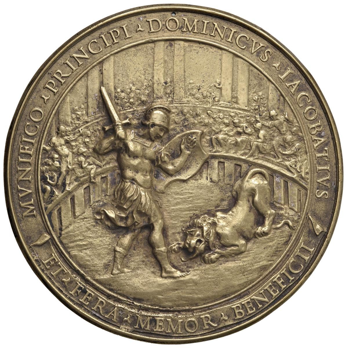 Alessandro VII (1655-1667) Medaglia da fusione 1659 A ricordo della peste, lotta al Circo Massimo tra il leone e Androclo, il quale fu graziato nel combattimento - Opus: Gioacchino Francesco Travani - Miselli 567 AE dorato (g 155 - Ø 98 mm) RR Piccolo foro sospensione. Piacevole fusione antica con tracce di argentatura sui rilievi del D/.