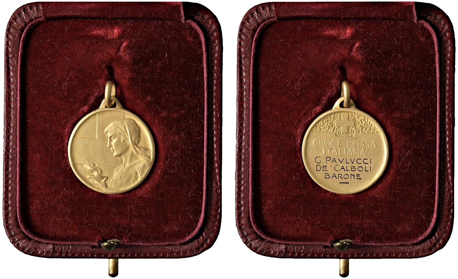 Regno d'Italia Medaglia senza data (secondo quarto del XX secolo) Croce Rossa Italiana al Barone G. Paulucci - Edizione S. Johnson Milano AU (g 8,38 - Ø 23 mm) R In cofanetto di emissione degli Stabilimenti Johnson.
