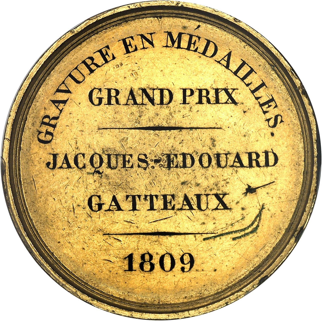 Rv. Gravure en creux : GRAVURE EN MÉDAILLES / GRAND PRIX / JACQUES-ÉDOUARD GATTEAUX/ 1809.