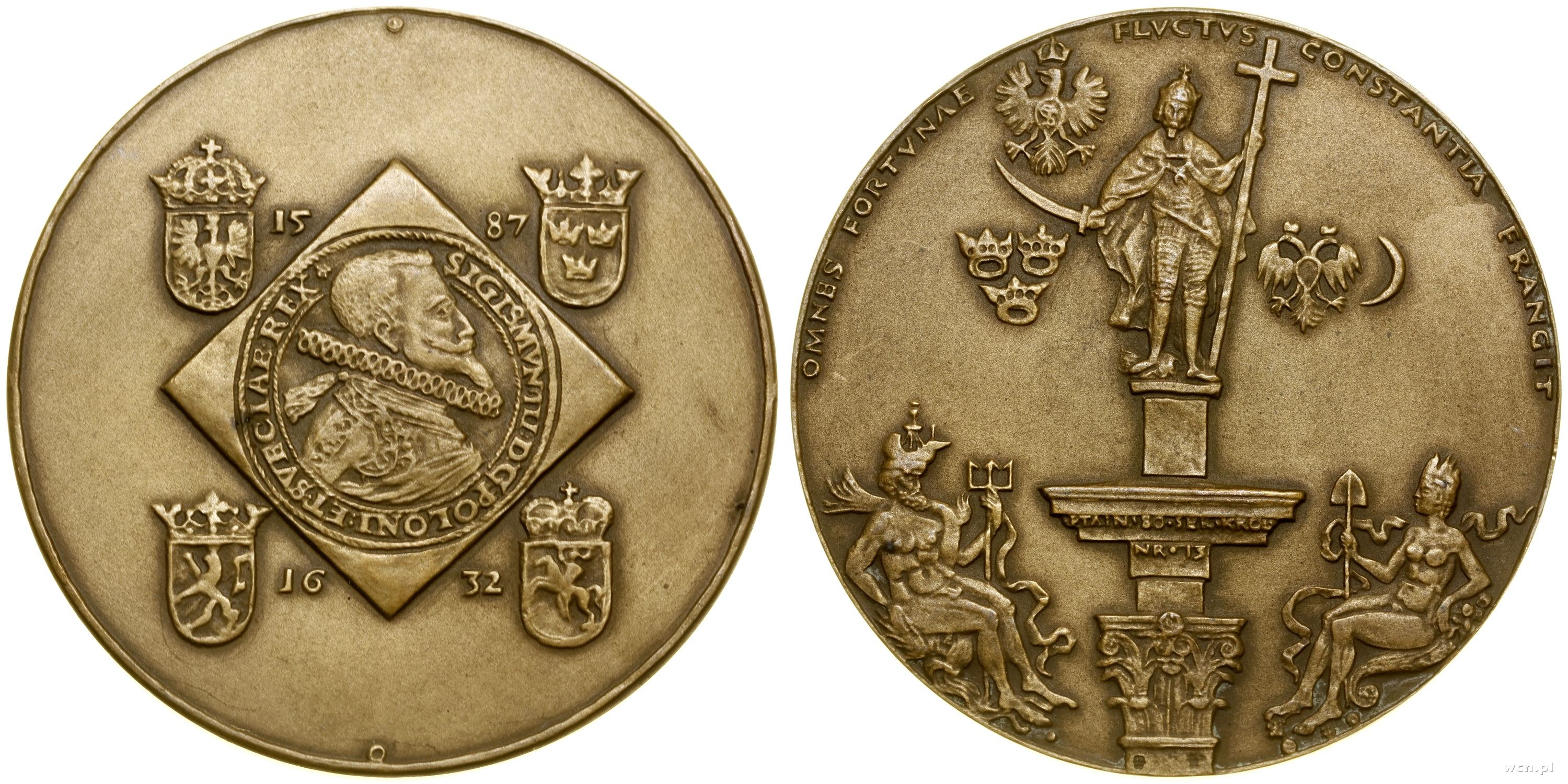 Aw: Awers klipy talarowej z 1614 roku, z boków daty 15 - 78 / 16 - 32, wokół tarcze herbowe Polski, Szwecji, Gotlandii i Litwy, Rw: Kolumna Zygmunta, z boków godła herbów Polski, Szwecji, Rosji i Turcji, u dołu z boków Posejdon i Cerera, na kolumnie PTAiN • 80 • SER • KRÓL • / NR • 13, OMNES FORTVNAE - FLVCTVS - CONSTANTIA FRANCIT, projektował Witold Korski