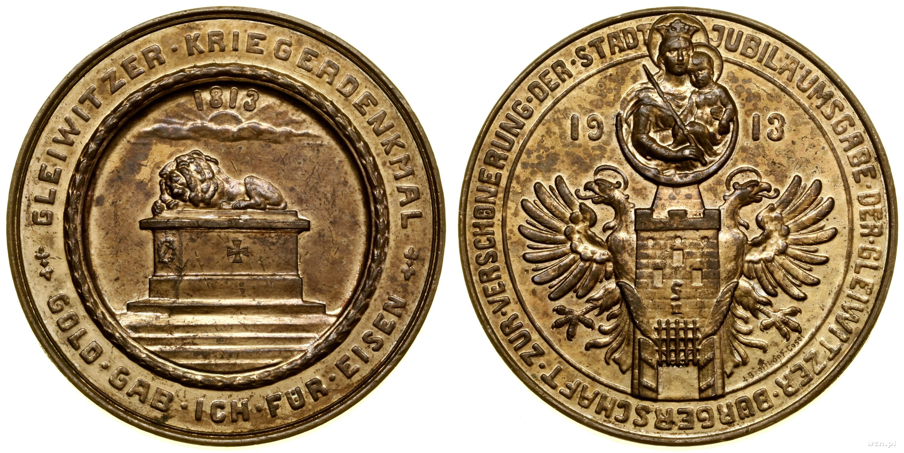 Aw: Pomnik śpiącego lwa, wyżej zachodzące słońce i data 1813, GLEIWITZER KRIEGERDENKMAL GOLD GAB ICH FUR EISEN; Rw: Herb Gliwic, z boków 19-13, JUBILÄUMSGABE DER GLEIWITZER BÜRGERSCHAFT ZUR VERSCHÖNERUNG DER STADT