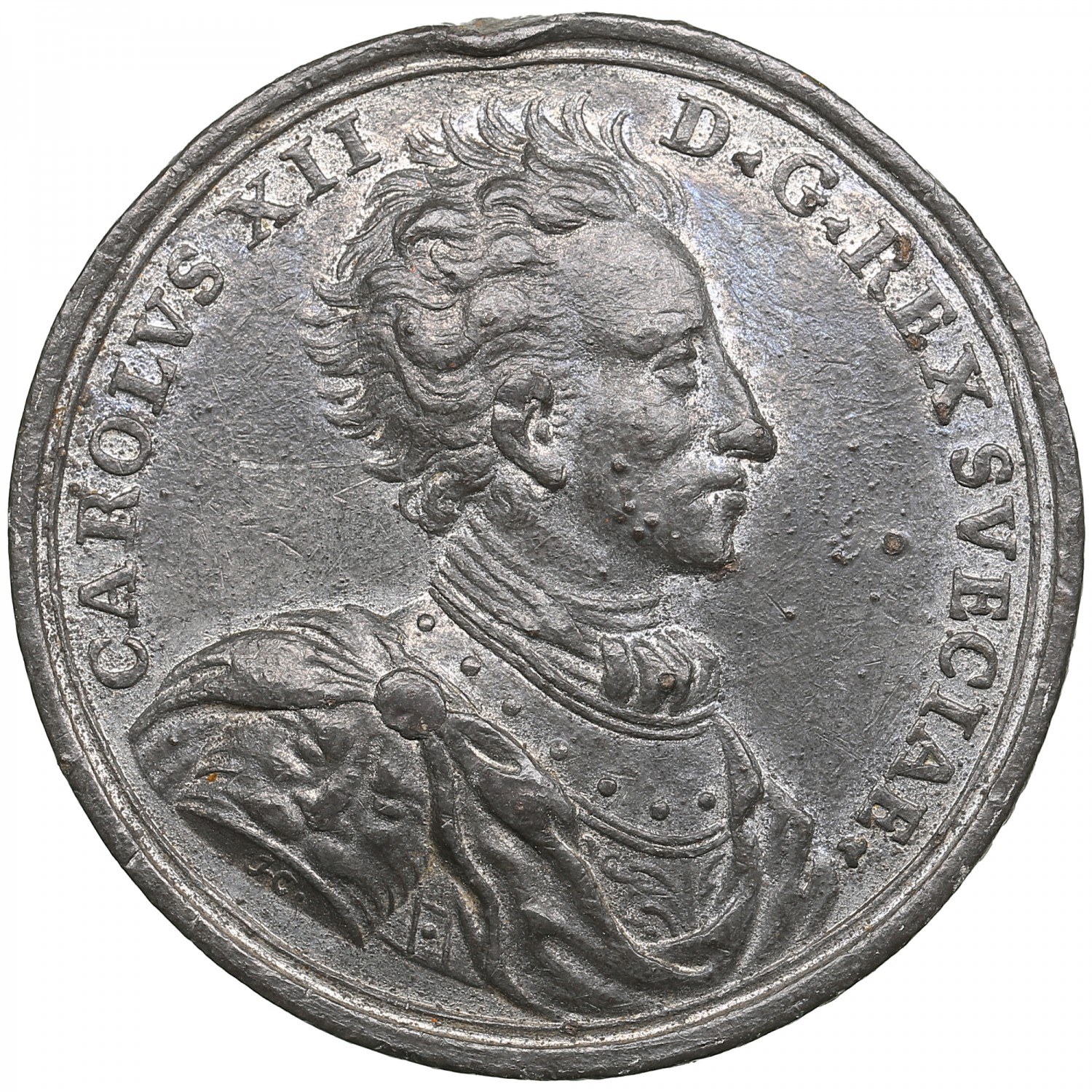 Obv.: Laureate and cuirassed bust of Charles XII of Sweden right, without periwig, wearing ornate armor and shoulder belt. Inscription around: CAROLVS XII D·G· REX SVECIAE · / H· (Charles XII, by the Grace of God, King of Sweden / H·).