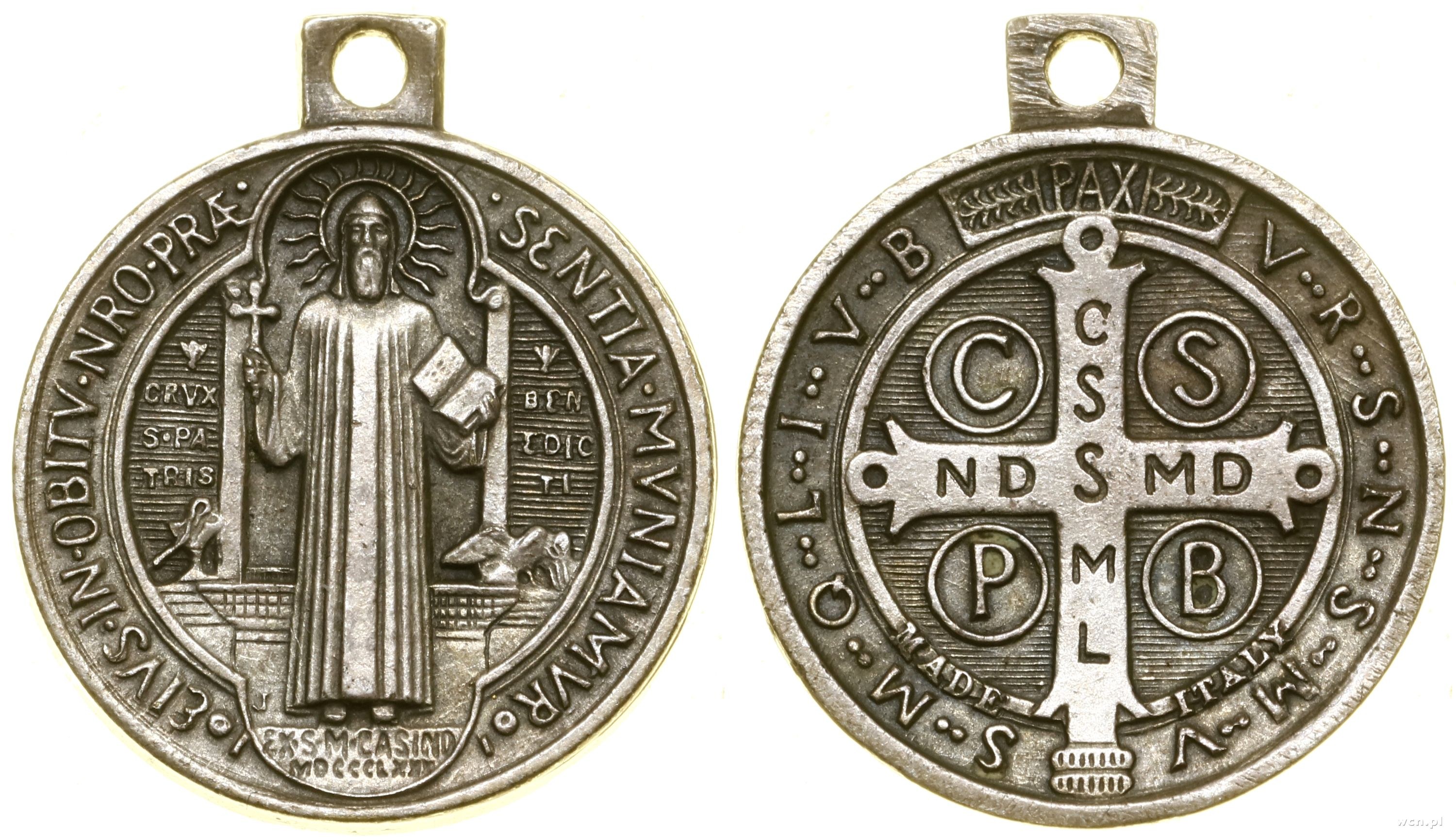 Aw: Św. Benedykt, trzymający krzyż i księgę, po bokach CRVX / S • PA / TRIS - BEN / EDIC / TI, • EIVS • IN • OBITV • NRO • PRÆ • - • SENTIA • MVNIAMVR •, Rw: Krzyż św. Benedykta, w kątach C - S - P - B, na ramionach krzyża, NDSMD - CSSML, u góry PAX, S • • M • • Q • • L • • I • • V • • B - V • • R • • S • • N • • S • • M • • V