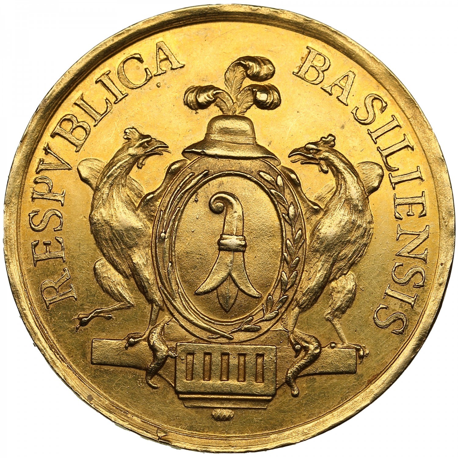 16.46g. 31mm. AU/AU. Medalier: Unknown (local engraver of the Basel Mint). Winterstein (Basler Medaillen) 272a; Schweizer Medaillen 1083; Wunderly 2207. Very rare. Obv.: Oval city coat of arms of Basel featuring a bishop’s crozier (Baselstab) surmounted by a feathered hat, supported by two basilisks standing on a pedestal. Inscription around: RESPVBLICA BASILIENSIS. (Republic of Basel.) Rev.: Seated city goddess facing left, wearing a mural crown, holding a fasces in her left hand and extending a laurel wreath in her right. Inscription around: DISPENSAT PRAEMIA DIGNIS / MDCCXCV. (She bestows rewards upon the worthy / 1795.) This medal was issued by the Republic of Basel in 1795 as a civic Verdienstmedaille (Merit Medal), awarded for outstanding service to the city. The allegorical figure represents Justice and Virtue rewarding the worthy, while the twin basilisks - traditional heraldic supporters of Basel - symbolize vigilance and protection. A fine example of late 18th-century Swiss medallic art.