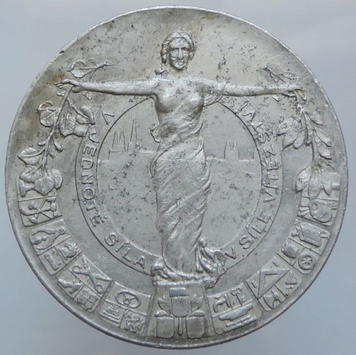 Al 50mm, Zemská jednota řemesl. a živnost. společenstev pro Čechy se sídlem v Praze", český lev ve štítě, 1895-1935/Viktoria s ratolestmi, v pozadí Praha "V jednotě síla, v síle vítězství", nep.škr.