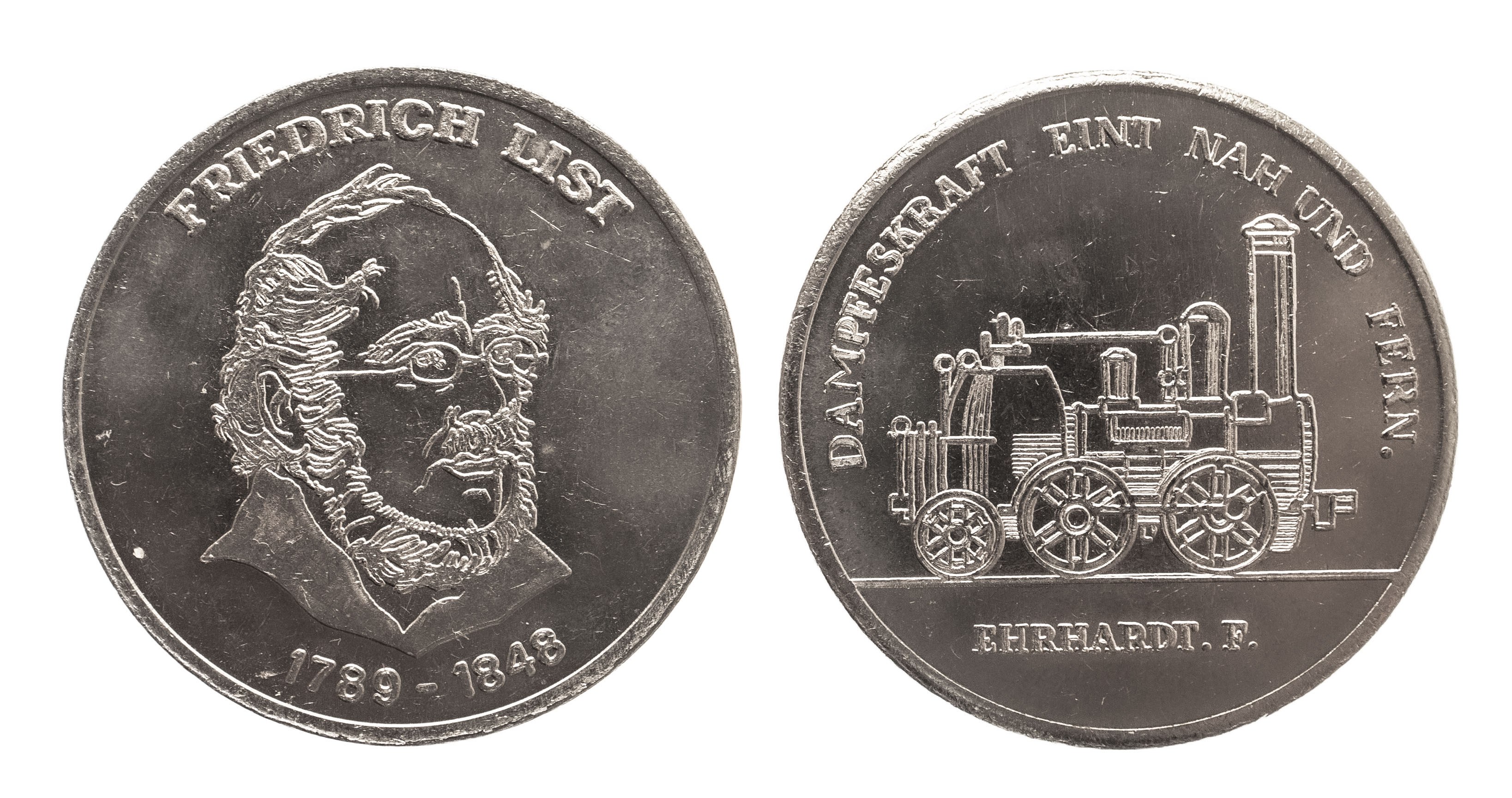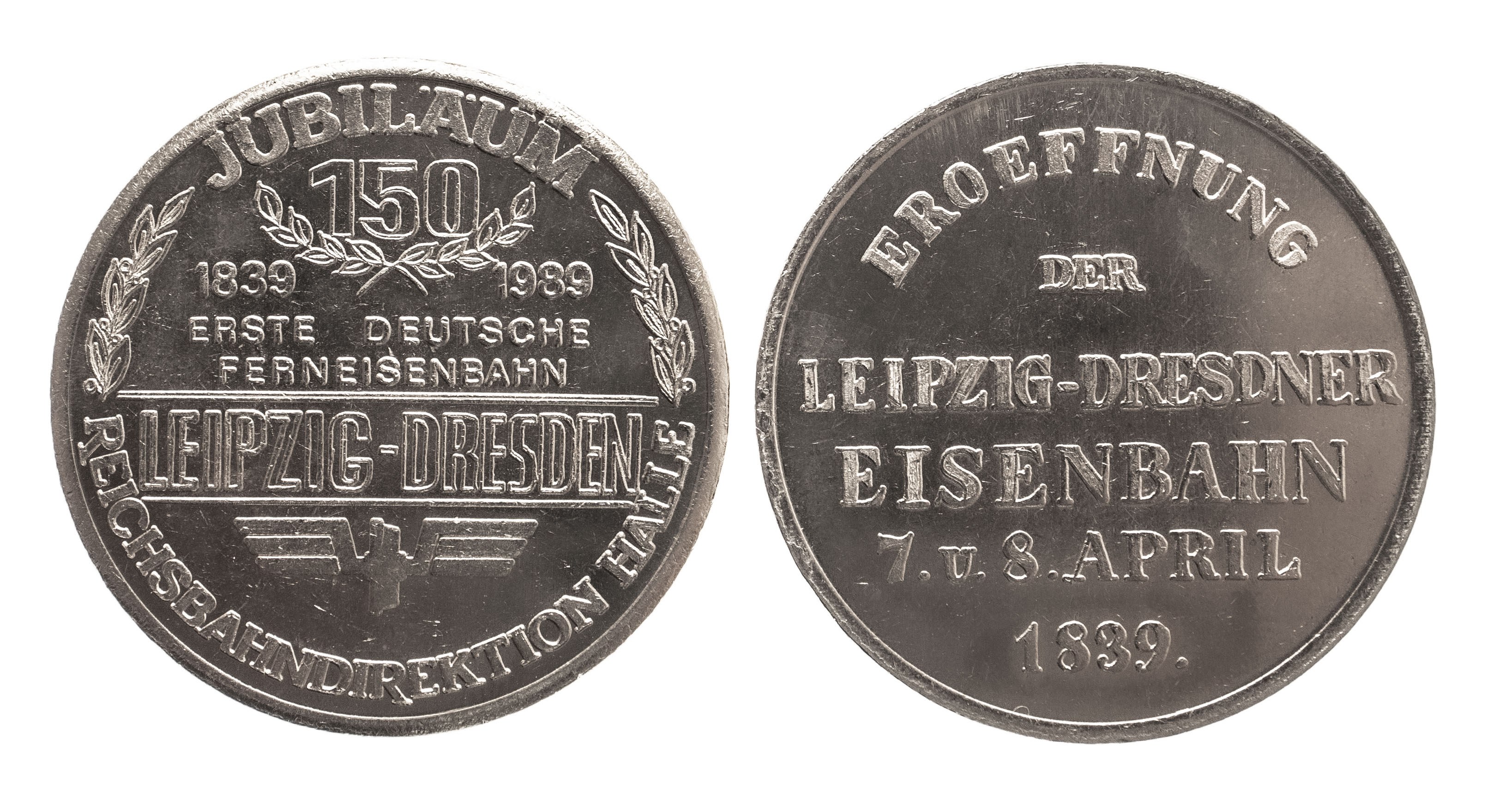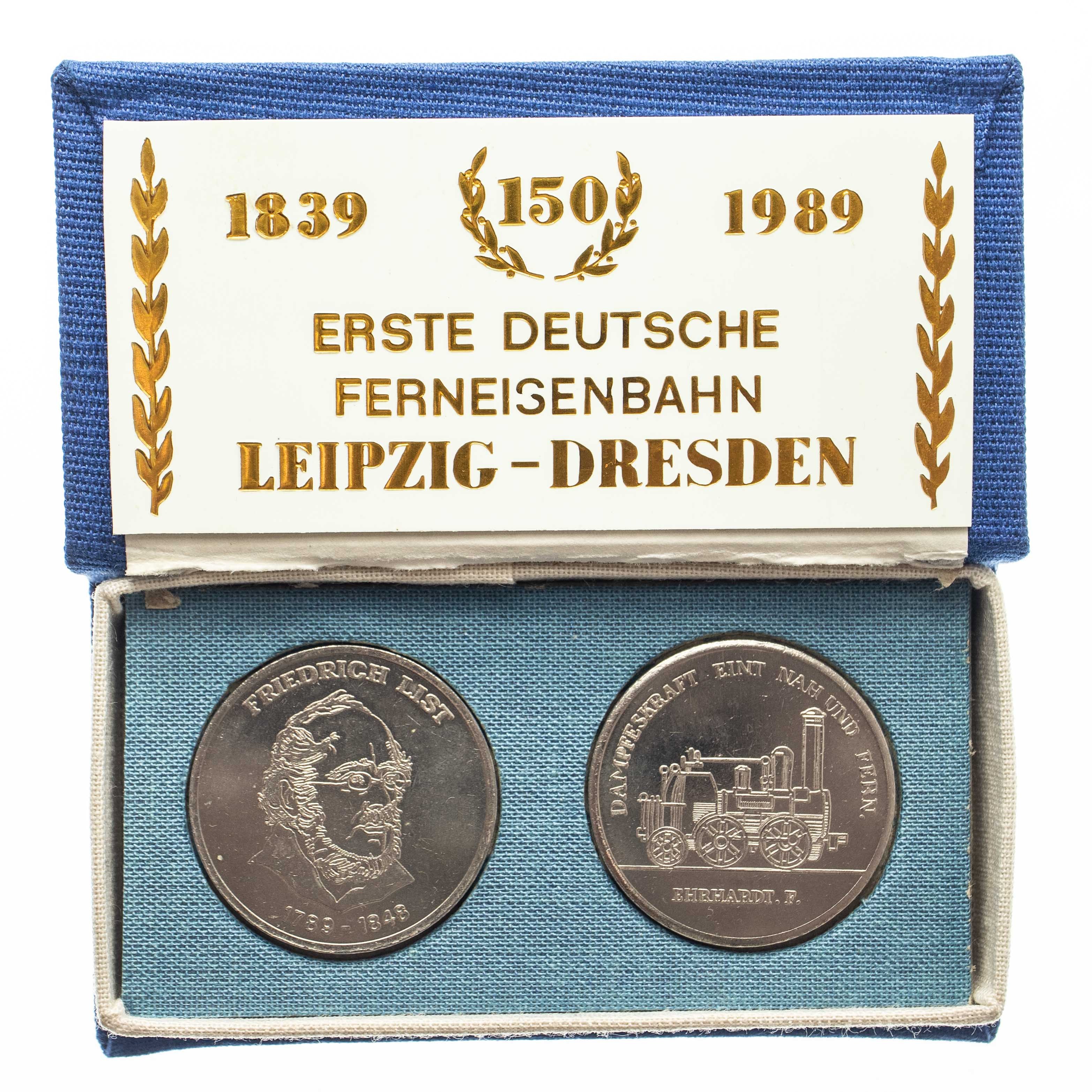 Dwa medale z okazji 150 Lat Pierwszej Niemieckiej Kolei Dalekobieżnej Lipsk - Drezno 1839-1989.