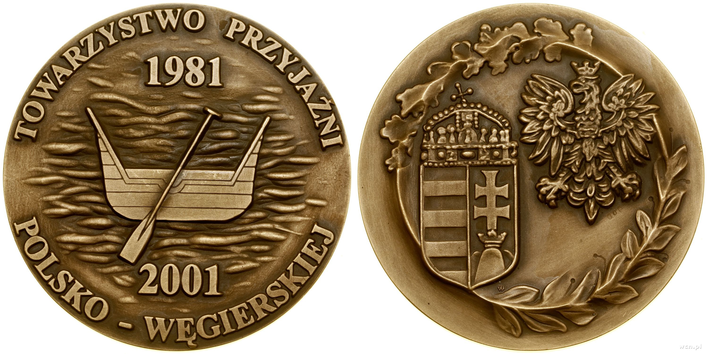 Aw: Stylizowana łódź na falach, u góry 1981, na dole 2001, TOWARZYSTWO PRZYJAŹNI - POLSKO - WĘGIERSKIEJ, Rw: Gałązka dębowa i laurowa, między nimi herb Węgier i godło Polski, projektował Zbigniew Dudek