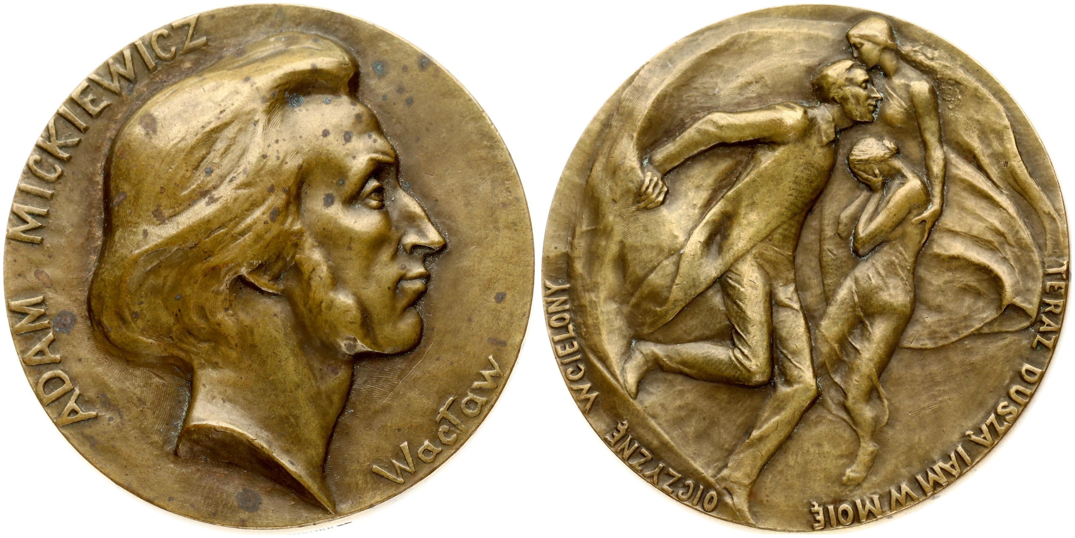 Poland Medal Adam Mickiewicz in Krakow 1898. Commemorating the unveiling of the monument to Adam Mickiewicz in Krakow 1898. Obverse: Poet's head to the right; around ADAM MICKIEWICZ / WACŁAW; Reverse: A symbolic scene from a sculpture by Szymanowski (located in the National Museum in Krakow); illustrating the awakening of the prophet from fainting after writing the third part of Dziady; at the bottom with an arc NOW THERE ARE IMMEDIATELY IN MY ORE; on the edge of the point BRONZE; medal designed by Wacław Szymanowski. Bronze. Weight approx: 117.49 g. Diameter: 60 mm.