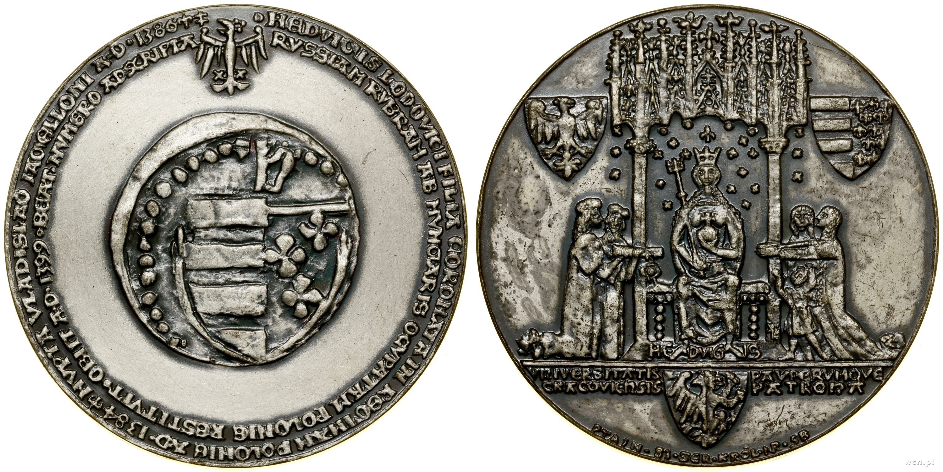Aw: Awers denara krakowskiego z literą h nad tarczą andegaweńską, powyżej Orzeł, HEDVIGIS LODOVICI FILIA CORONATA IN REGINAM POLONIE A•D• 1384 HVPTA VLADISLAO JAGIELLONI A•D• 1386 / RVSSIAM RVBRAM AB HVNGARIS OCVPATAM POLONIE RESTITVTIT • ORIIT A•D• 1399 BEAT • NVMERO ADSCRIPTA, Rw: Król w majestacie, z lewej przedstawiciele Uniwerytetu Krakowskiego, z prawej biedota, poniżej VNIVERSITATIS CRACOVIENSIS / PAVPERUMQVE PATRONA, poniżej PTAiN 83 SER KRÓL NR 5B, projektował Witold Korski