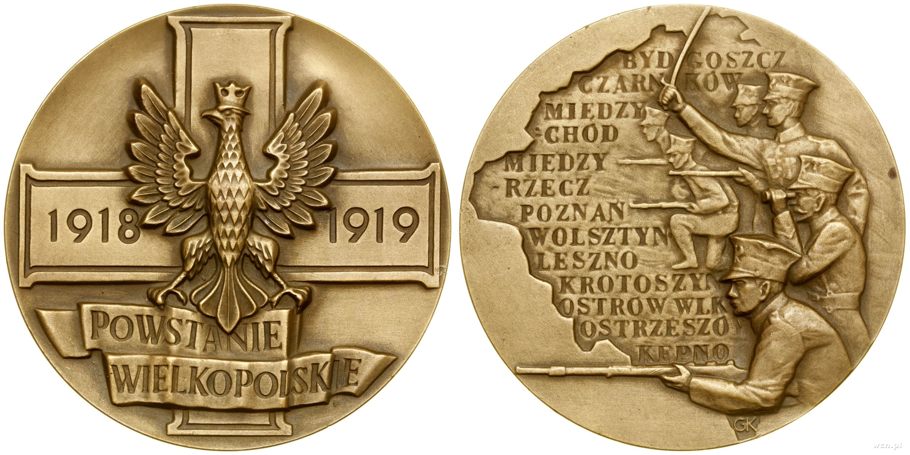 Aw: Orzeł w koronie na tle krzyża, daty po bokach 1918-1919, poniżej szarfa z napisem POWSTANIE WIELKOPOLSKIE, Rw: Grupa powstańców, po lewej zarys zachodniej granicy Wielkopolski z zapisanymi miejscowościami, projektował Grzegorz Kowalski