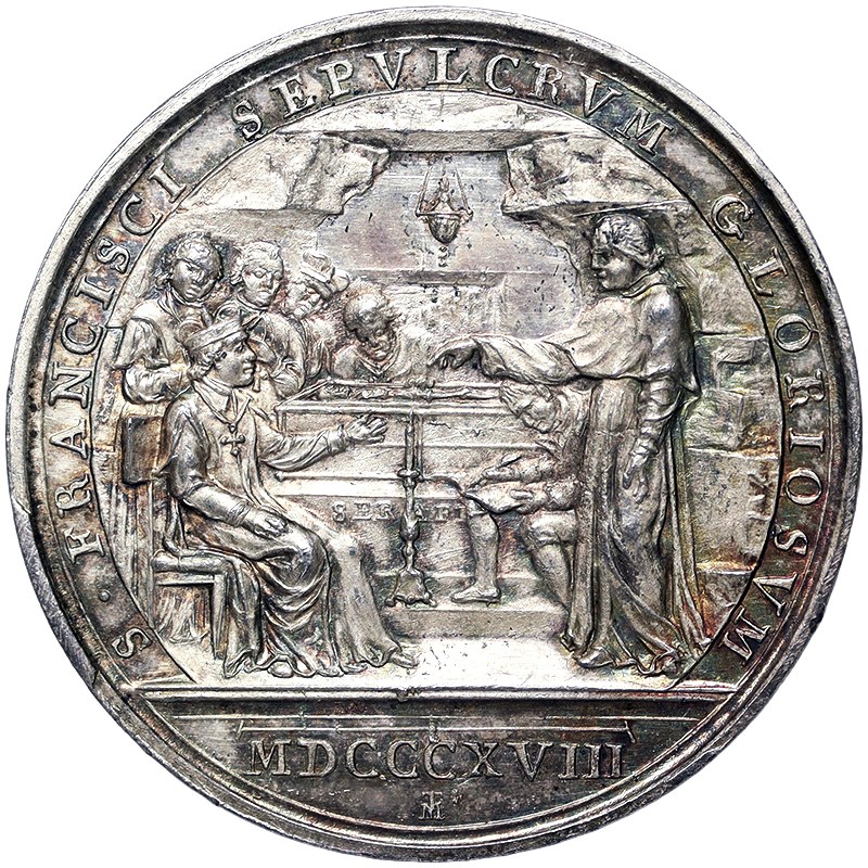 Annual. For the discovery and official recognition of the body of St.Francis of Assisi. D: PIVS VII PONT MAX ANNO XXII bust of the pontiff on the right, below the bust T MECANDETTI F MDCCCXXI - R: S FRANCISCI SEPVLCRVM GLORIOSVM. Opus: Tommaso Mercandetti. Ø 41,5 mm. Ag. 33,65 g Very rare