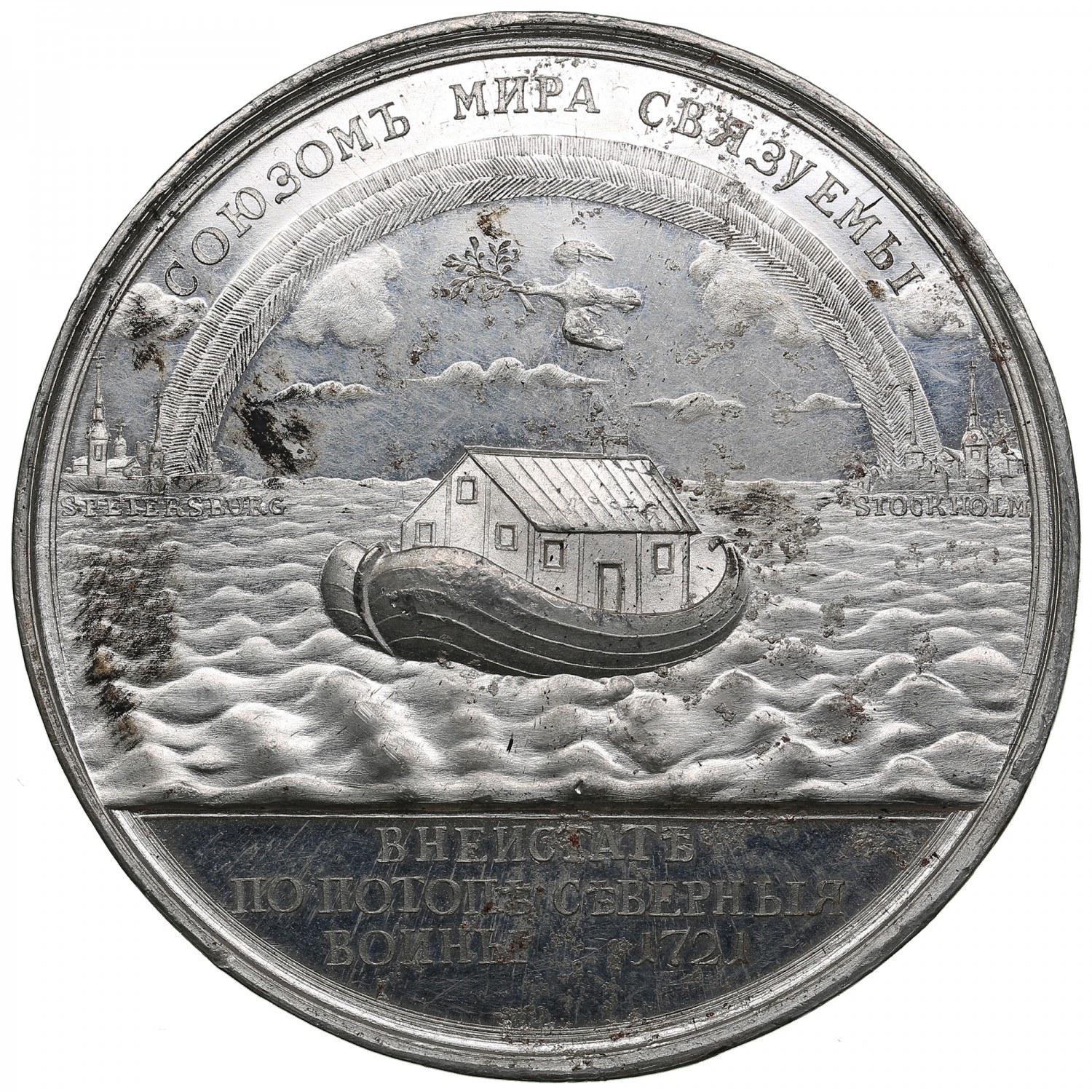 55.88g. 60mm. UNC/UNC. Bright mirror mint luster. Medalier: unknown. Diakov 57.2 (Ar - R2). Medals of the Peace of Nystad bearing Russian inscriptions are encountered rather infrequently. Obv.: In the center, Noah’s Ark; above, a flying dove with an olive branch in its beak. On the horizon at left, the view of St. Petersburg; at right, Stockholm, connected by a rainbow with the inscriptions S. PETERSBURG and STOKHOLM. Inscription above: СОЮЗОМЪ МИРА СВЯЗУЕМЫ (Bound by the union of peace). Below the truncation, in three lines: ВЬНЕИСТАТѢ | ПОПОТОПѢ СЕВЕРЪНЫЯ | ВОИНЫ 1721 (After the flood of northern wars, at Nystad, 1721). Rev.: Straight thirteen-line inscription: В • И • Б • Щ | ГОСУДАРЮ | ПЕТРУ • I • | IМЕНЕМЪ • IДѢЛАМИ • ПРЕДИВНЫМИ | ВЕЛИКОМУ • | РОССИСКОМУ • IМПЕРАТОРУ • | И ОТЦУ | ПО ДВАДЕСЯТОЛѢТНЫХЪ • ТРIУМѲОВЪ | СѢВЕРЪ • УМИРИВШЕМУ • | СИЯ • ИЗЪ ЗЛАТА • ДОМАШНЕГО | МЕДАЛIЯ | УСЕРДНЕIШЕ • ПРИНОСИ | ТСЯ • (To the most great and pious sovereign Peter I, by name and by deeds wondrous, the great Russian Emperor and Father, who after twenty years of triumphs pacified the North; this medal of domestic gold is most fervently presented). The medal commemorates the conclusion of the Peace of Nystad, signed on 30 August 1721 between the Russian Empire and the Kingdom of Sweden, formally ending the Great Northern War (1700–1721). By this treaty Sweden ceded Ingria, Estonia, Livonia, and part of Karelia to Russia, while retaining Finland. The peace secured for Peter the Great access to the Baltic Sea and international recognition of Russia as a European power, marking the decline of Sweden’s dominance in Northern Europe. Soon after the treaty, Peter assumed the title Emperor of All Russia, symbolizing the birth of the Russian Empire and the new political balance that reshaped the North for the century ahead.