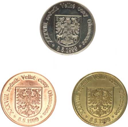 Olomouc - 4. Světový den IAAF - Juniorský mítink, stoj. Venuše na globu / XXXVIII. ročník Velké ceny Olomouce 8.5. 1999, městský zn ak bronz +Cu +mosaz 30 mm (vydáno á 50 ks) PMP I/610 a, b , c 3 ks