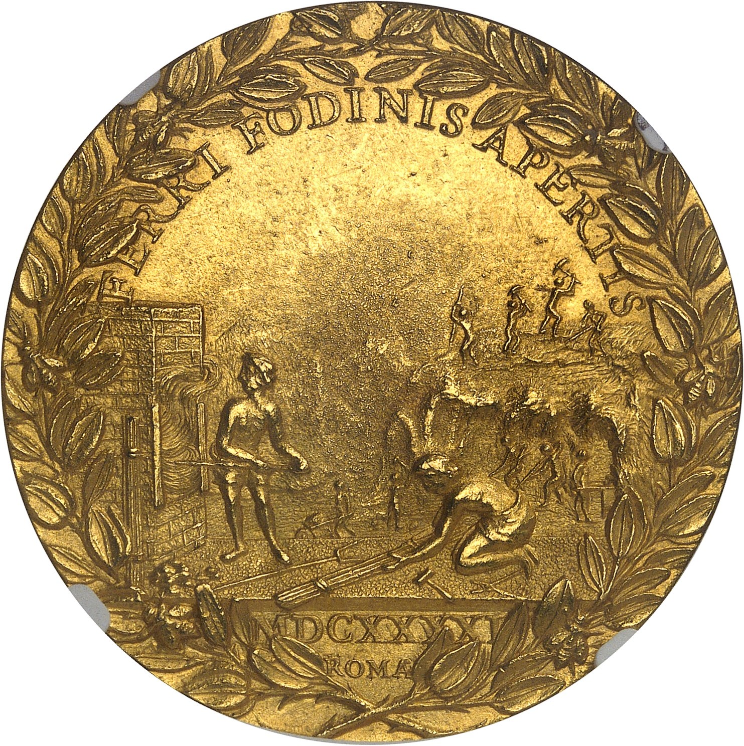Rv. FERRI FODINIS APERTIS. Dans une couronne formée de deux branches de laurier, des ouvriers devant un four avec d’autres ouvriers travaillant aux mines en arrière-plan ; au-dessous (date) et ROMA.