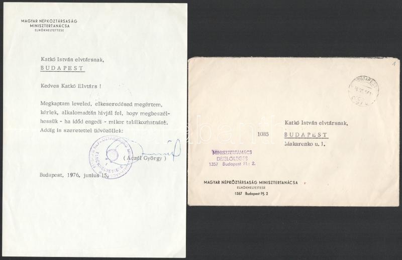 1975 Bp., Aczél György politikus, miniszterelnök-helyettes által aláírt levél és borítékja